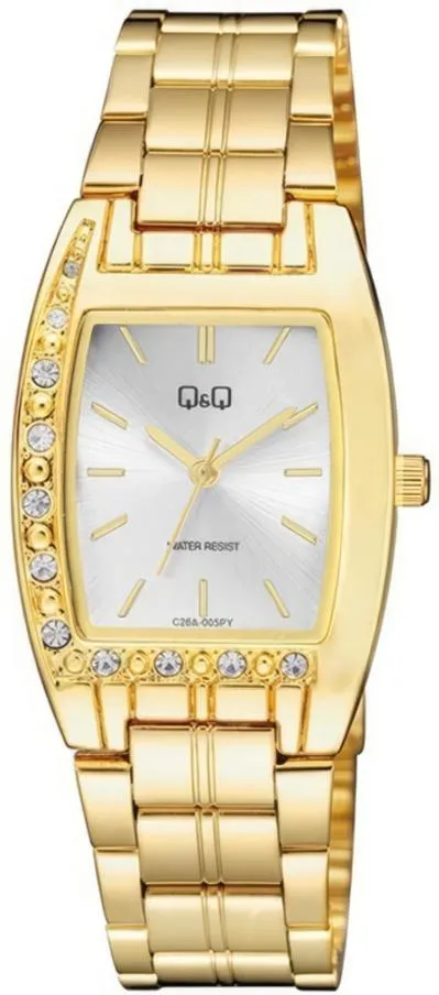 Женские наручные часы Q&Q Casual C26AJ005Y. Точный кварцевый механизм с аналоговой индикацией. Браслет из нержавеющей стали. Браслет из нержавеющей стали. Прочное, устойчивое к царапинам минеральное стекло защищает часы от повреждений. Часы являются водонепроницаемыми до 3 Бар. Цвет циферблата: Желтое золото. Цвет корпуса: Серебристый. Толщина: 8 мм. Гарантия: 1 год.