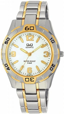 Мужские наручные часы Q&Q Casual F282J404Y. Точный кварцевый механизм с аналоговой индикацией. Браслет из нержавеющей стали. Латунный браслет. Прочное, устойчивое к царапинам минеральное стекло защищает часы от повреждений. Часы являются водонепроницаемыми до 5 Бар. Цвет циферблата: Серебристый. Цвет циферблата: Желтое золото. Цвет корпуса: Белый. На стрелки и отметки нанесен светонакопительный состав, благодаря этому считывать информацию с циферблата возможно и в темноте. Толщина: 10 мм. Гарантия: 1 год.