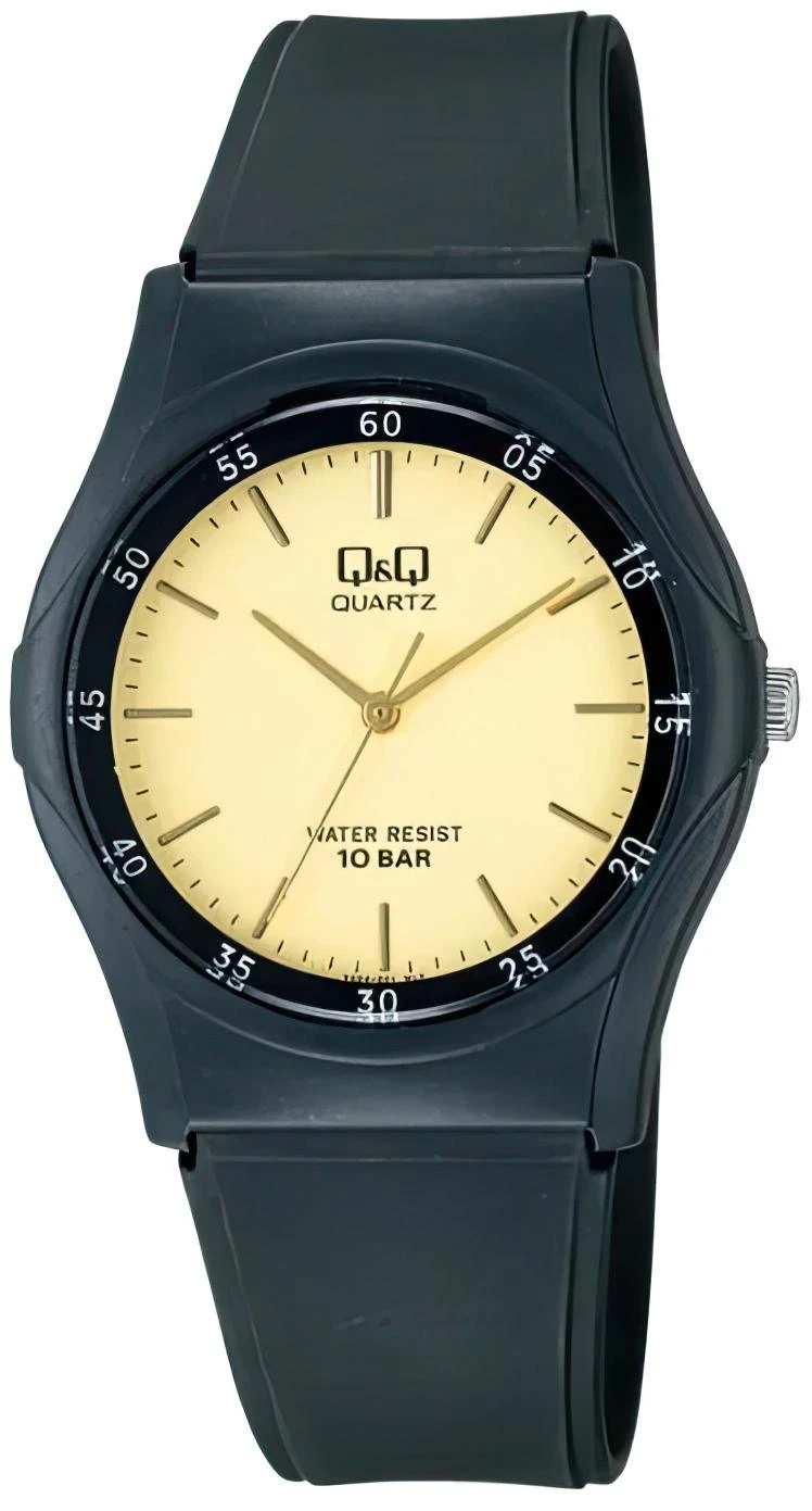 <b>Мужские наручные часы Q&Q VQ04J001Y.</b> Точный кварцевый механизм с аналоговой индикацией. Полимерный корпус надежно защищает часы от механических повреждений. Полимерный ремешок. Натуральный полимерный материал является идеальным для изготовления ремешка благодаря своей чрезвычайной прочности и гибкости. Органическое стекло. Часы являются водонепроницаемыми до 10 Бар. Цвет корпуса: Черный. Цвет циферблата: Золотистый. Гарантия: 1 год.