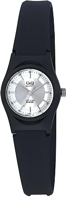 <b>Женские наручные часы Q&Q  VQ87J002Y.</b> Точный кварцевый механизм с аналоговой индикацией. Полимерный корпус надежно защищает часы от механических повреждений. Полимерный ремешок. Натуральный полимерный материал является идеальным для изготовления ремешка благодаря своей чрезвычайной прочности и гибкости. Органическое стекло. Часы являются водонепроницаемыми до 10 Бар. Цвет корпуса: Черный. Гарантия: 1 год.
