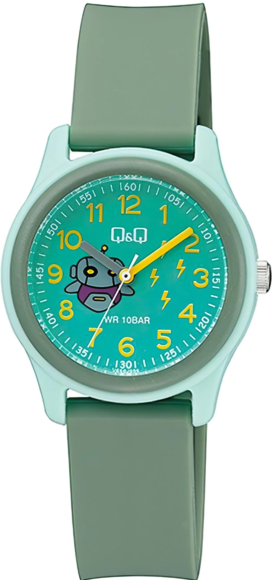 Детские наручные часы Q&Q Kids VS59J006Y. Точный кварцевый механизм с аналоговой индикацией. Полимерный ремешок. Натуральный полимерный материал является идеальным для изготовления ремешка благодаря своей чрезвычайной прочности и гибкости. Полимерный ремешок. Натуральный полимерный материал является идеальным для изготовления ремешка благодаря своей чрезвычайной прочности и гибкости. Органическое стекло. Часы являются водонепроницаемыми до 10 Бар. Цвет циферблата: Зеленый. Цвет корпуса: Зеленый. Толщина: 10 мм. Гарантия: 1 год.