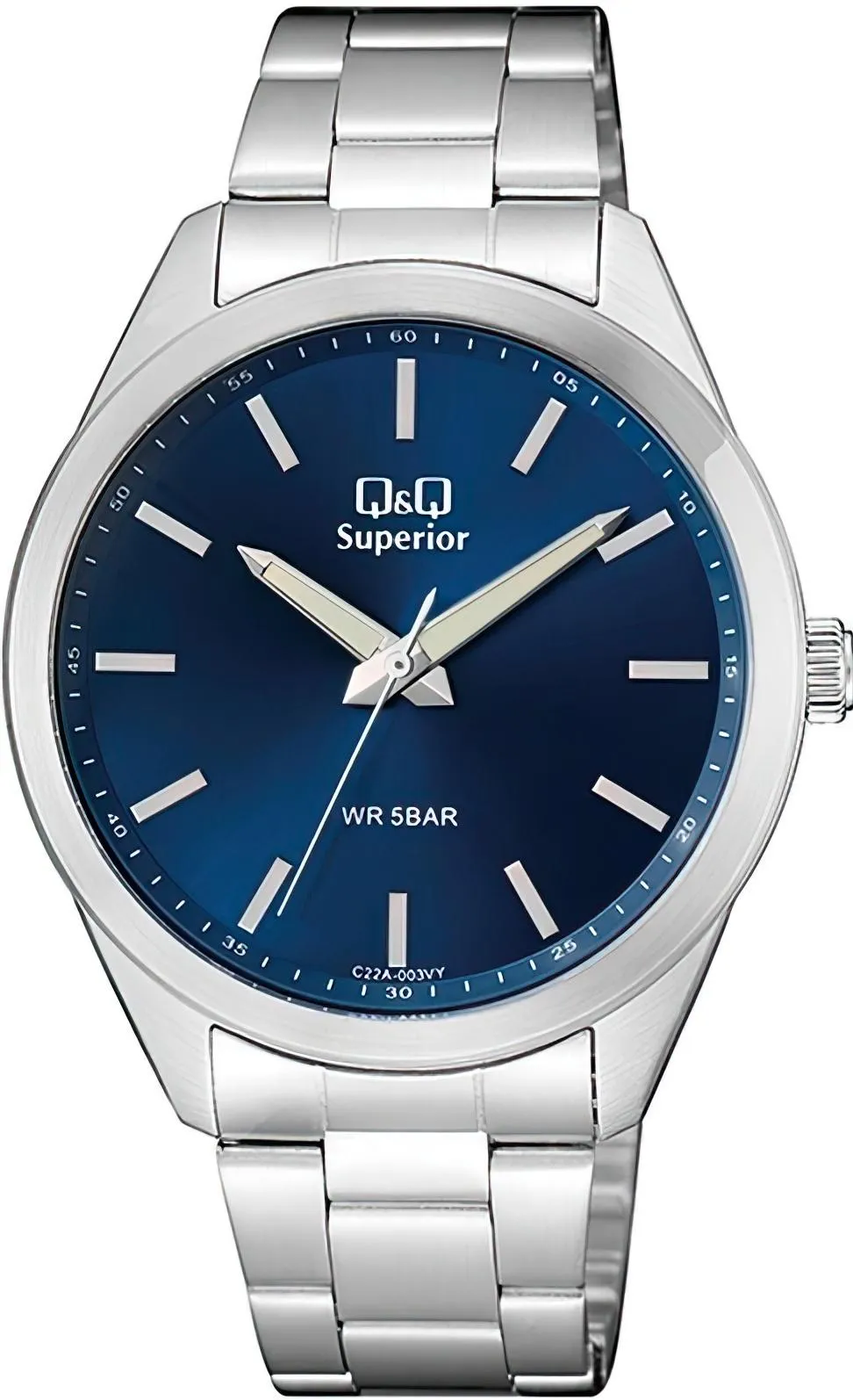 Мужские наручные часы Q&Q Superior C22AJ003Y. Точный кварцевый механизм с аналоговой индикацией. Браслет из нержавеющей стали. Браслет из нержавеющей стали. Прочное, устойчивое к царапинам минеральное стекло защищает часы от повреждений. Часы являются водонепроницаемыми до 5 Бар. Цвет циферблата: Серебристый. Цвет корпуса: Синий. На стрелки и отметки нанесен светонакопительный состав, благодаря этому считывать информацию с циферблата возможно и в темноте. Толщина: 10 мм. Гарантия: 1 год.