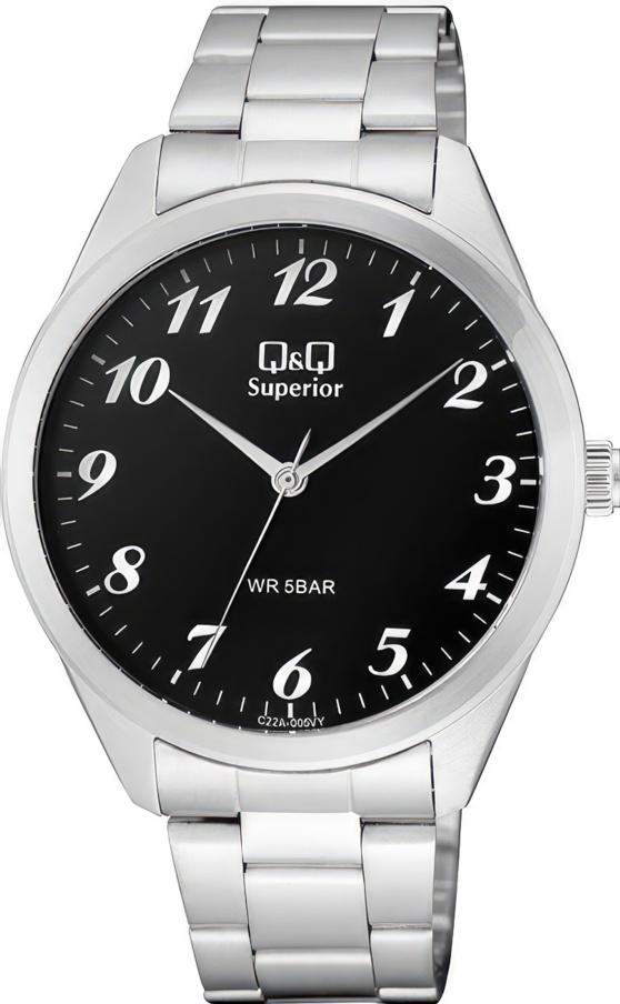 Мужские наручные часы Q&Q Superior C22AJ005Y. Точный кварцевый механизм с аналоговой индикацией. Браслет из нержавеющей стали. Браслет из нержавеющей стали. Прочное, устойчивое к царапинам минеральное стекло защищает часы от повреждений. Часы являются водонепроницаемыми до 5 Бар. Цвет циферблата: Серебристый. Цвет корпуса: Черный. Толщина: 10 мм. Гарантия: 1 год.