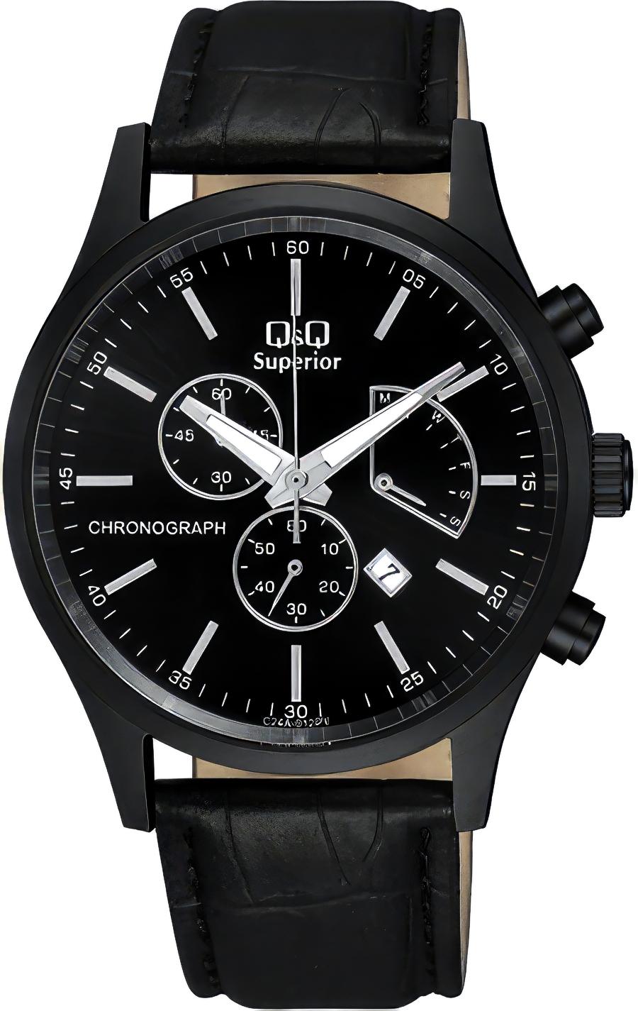 Мужские наручные часы Q&Q Superior C24AJ012Y. Точный кварцевый механизм с аналоговой индикацией. Ремешок изготовлен из кожи. Функция хронографа. Браслет из нержавеющей стали. Прочное, устойчивое к царапинам минеральное стекло защищает часы от повреждений. На циферблате отображается текущее число месяца и день недели. Часы являются водонепроницаемыми до 5 Бар. Цвет циферблата: Черный. Цвет корпуса: Черный. На стрелки и отметки нанесен светонакопительный состав, благодаря этому считывать информацию с циферблата возможно и в темноте. Толщина: 11 мм. Гарантия: 1 год.