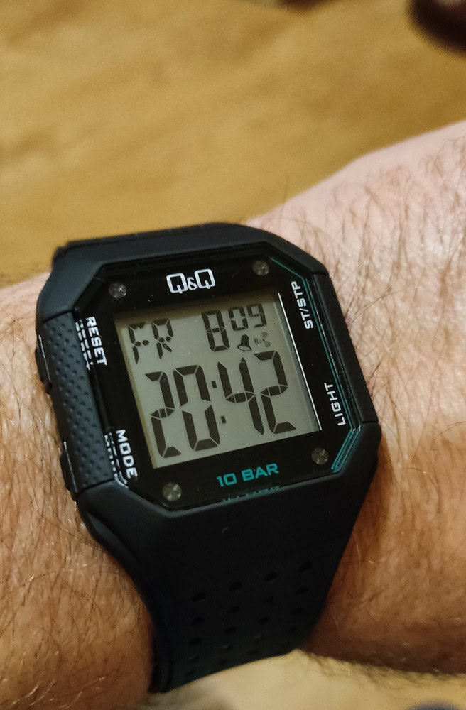 Электронные часы с точность хода не хуже -10 +15 сек./в месяц. • Ежедневный будильник со звуковым сигналом. • Секундомер. • Таймер обратного осчета. • Автоматический календарь. • Электрическая подсветка.  • Легкое и прочное хезалитовое стекло. • Корпус из полимерных материалов. • Водозащита до 10 АТМ.  • Черный ремешок из полимерного материала. • Простая ремешковая застежка.  • Диаметр 40 мм, толщина 12 мм. Вес 48 мм.