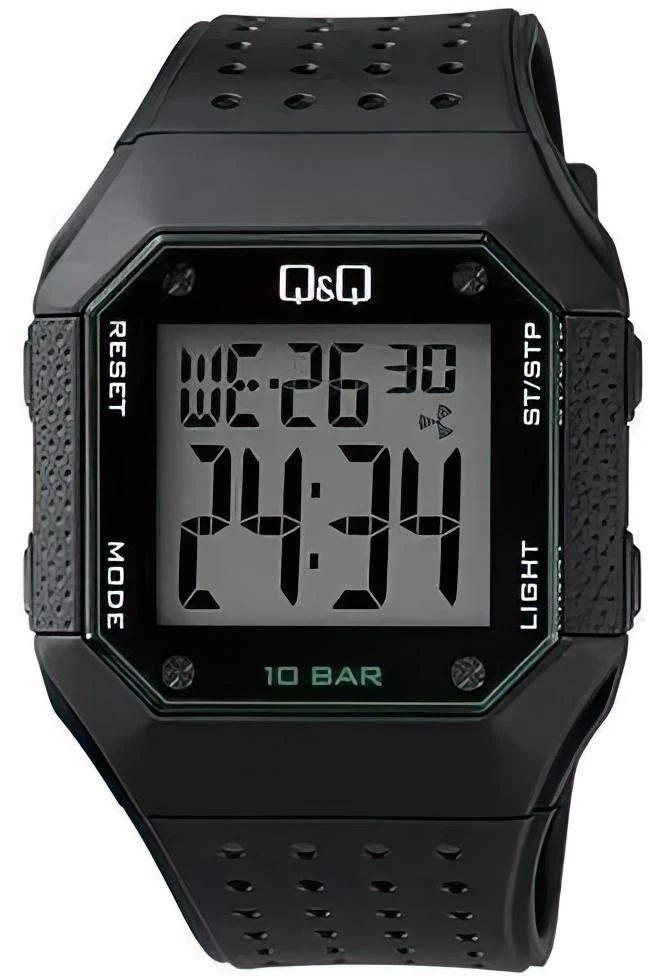 Электронные часы с точность хода не хуже -10 +15 сек./в месяц. • Ежедневный будильник со звуковым сигналом. • Секундомер. • Автоматический календарь. • Электрическая подсветка.  • Легкое и прочное хезалитовое стекло. • Корпус из полимерных материалов. • Водозащита до 10 АТМ.  • Черный ремешок из полимерного материала. • Простая ремешковая застежка.  • Диаметр 40 мм, толщина 12 мм. Вес 48 мм.