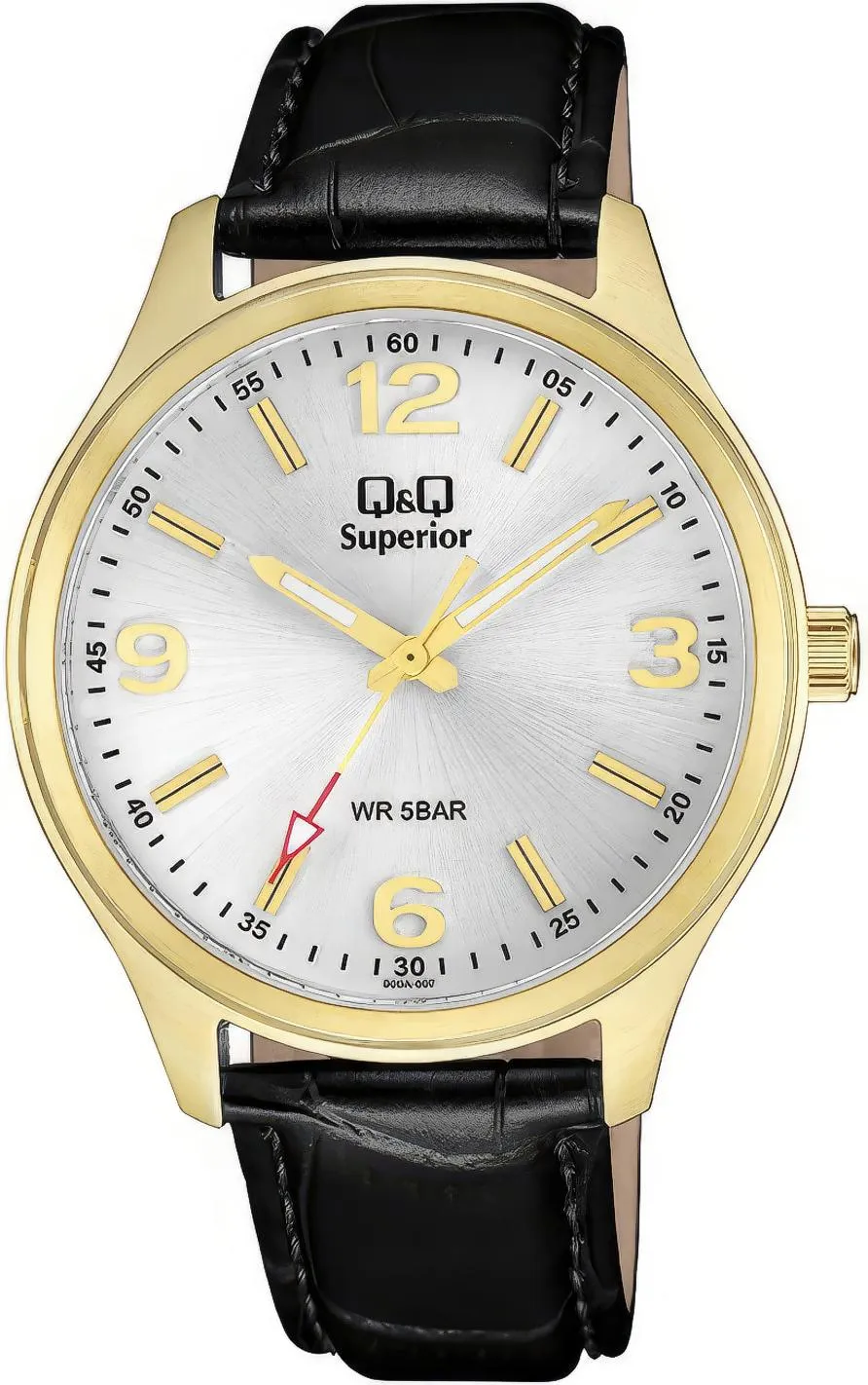 Мужские наручные часы Q&Q Superior S00AJ007Y. Точный кварцевый механизм с аналоговой индикацией. Ремешок изготовлен из кожи. Браслет из нержавеющей стали. Прочное, устойчивое к царапинам минеральное стекло защищает часы от повреждений. Часы являются водонепроницаемыми до 5 Бар. Цвет циферблата: Желтое золото. Цвет корпуса: Серебристый. На стрелки и отметки нанесен светонакопительный состав, благодаря этому считывать информацию с циферблата возможно и в темноте. Толщина: 9 мм. Гарантия: 1 год.