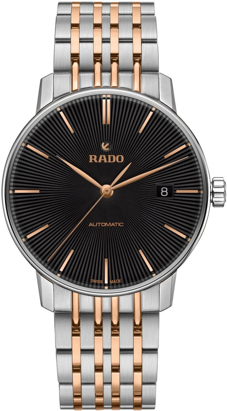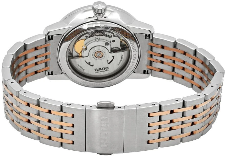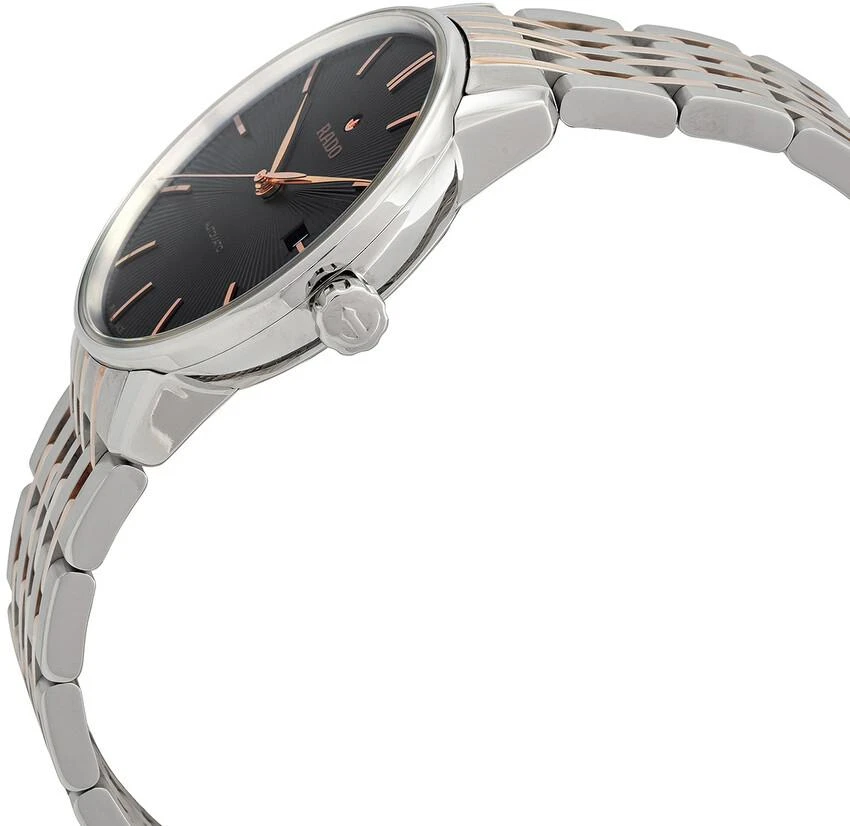 Корпус из нержавеющей стали серебристого тона с двухцветным (серебристый и розовое золото PVD) браслетом из нержавеющей стали. Фиксированный безель из нержавеющей стали серебристого тона. Черный циферблат со стрелками и часовыми метками оттенка розового золота. Тип циферблата: аналоговый. Указатель даты в положении «3 часа». Автоматический механизм с запасом хода до 80 часов. Сапфировое стекло, устойчивое к царапинам. Заводная головка с выдвижением/нажатием. Круглая форма корпуса, размер корпуса: 37,7 мм, толщина корпуса: 10,2 мм. Раскрытие с помощью застежки с кнопкой. Водонепроницаемость до 50 метров / 165 футов. Функции: дата, часы, минуты, секунды.
