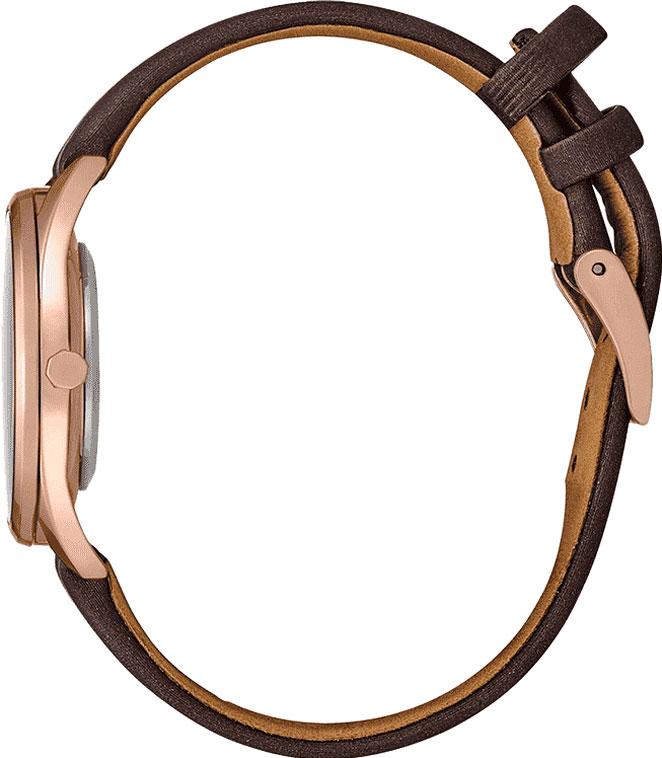 Женские кварцевые часы. Водостойкость WR 50. Часы, минуты. Циферблат с часовыми индексами в виде штрихов. Корпус выполнен из нержавеющей стали с покрытием. Диаметр корпуса 32 мм, толщина 7 мм. Устойчивое к возникновению мелких механических повреждений минеральное стекло повышенной прочности Hardlex. Кожаный ремешок коричневого цвета.