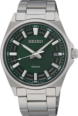 Мужские наручные часы Seiko CS Sports SUR503P1. Точный кварцевый механизм с аналоговой индикацией. Браслет из нержавеющей стали. Браслет из нержавеющей стали. Прочное, устойчивое к царапинам минеральное стекло защищает часы от повреждений. На циферблате отображается текущее число месяца. Часы являются водонепроницаемыми до 10 Бар. Цвет циферблата: Серебристый. Цвет корпуса: Зеленый. На стрелки и отметки нанесен светонакопительный состав, благодаря этому считывать информацию с циферблата возможно и в темноте. Толщина: 10 мм. Гарантия: 2 года.