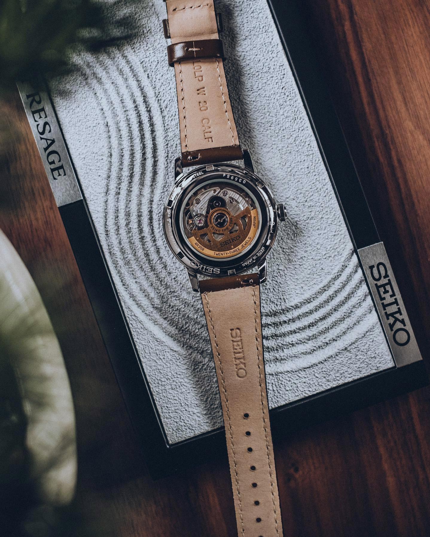 Presage Cocktail Time Mojito. Циферблат с метками в виде штрихов и арабских цифр. Текстура циферблата вдохновлена гранями хрустальных бокалов. Секундная стрелка выполнена в виде палочки для перемешивания коктейлей.