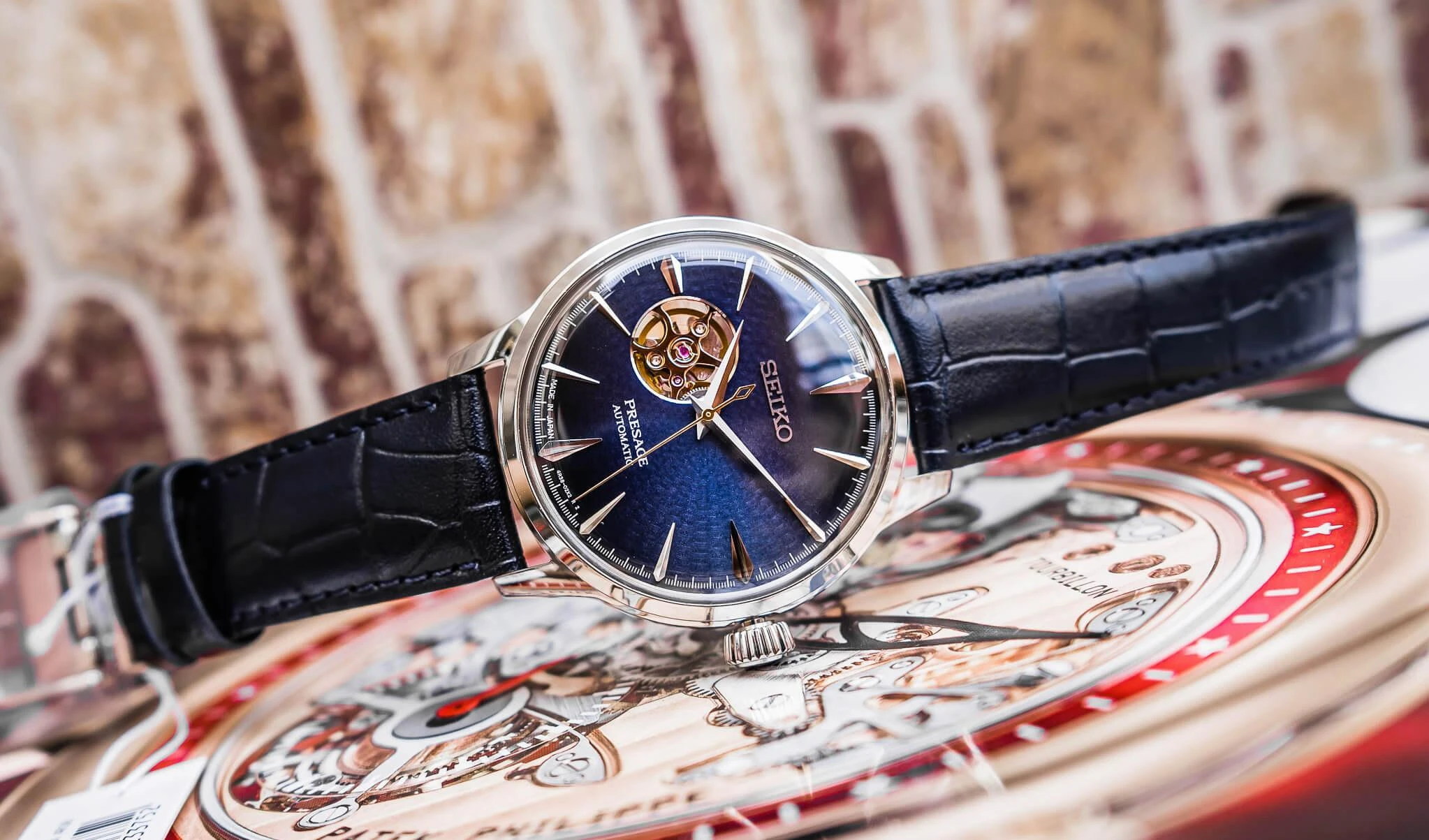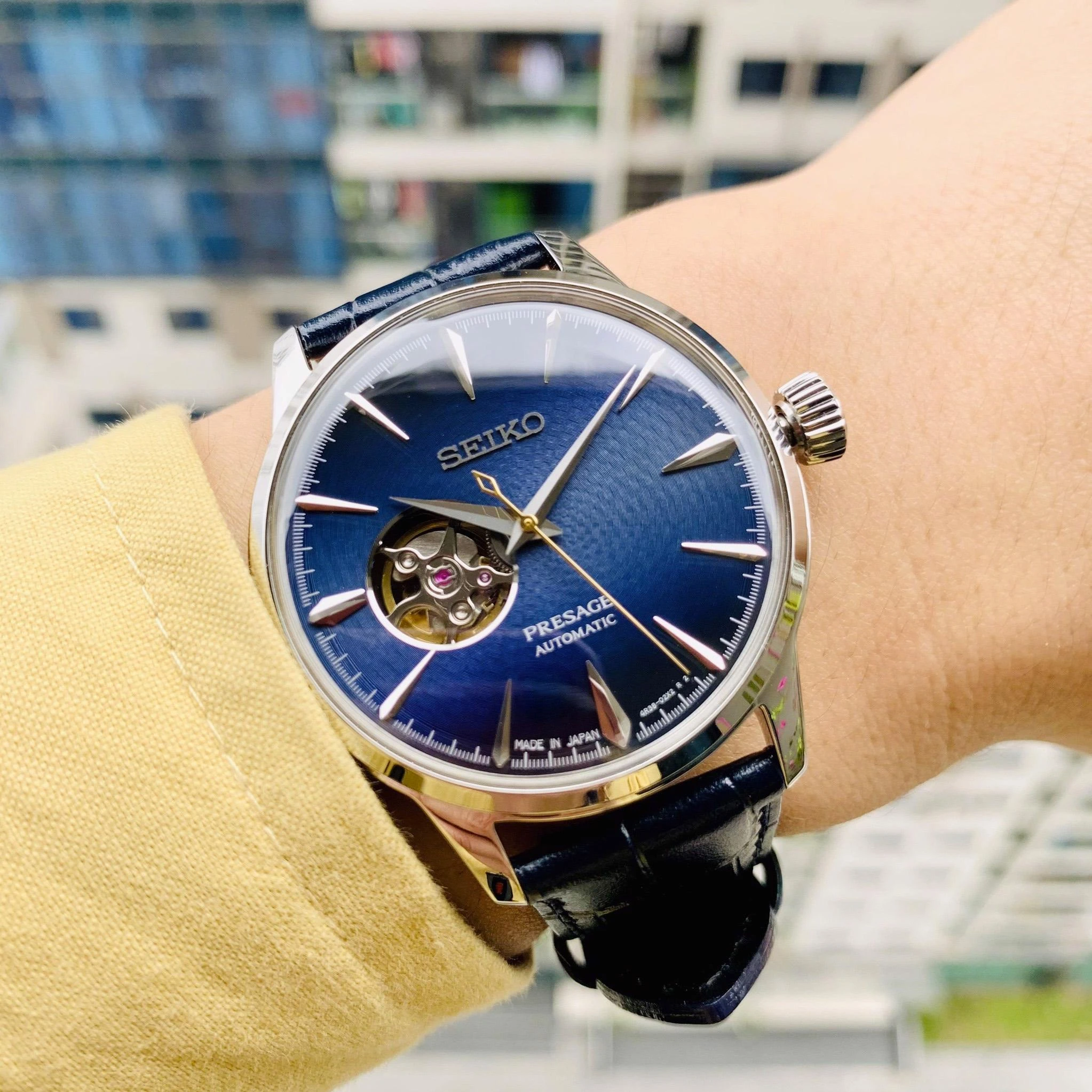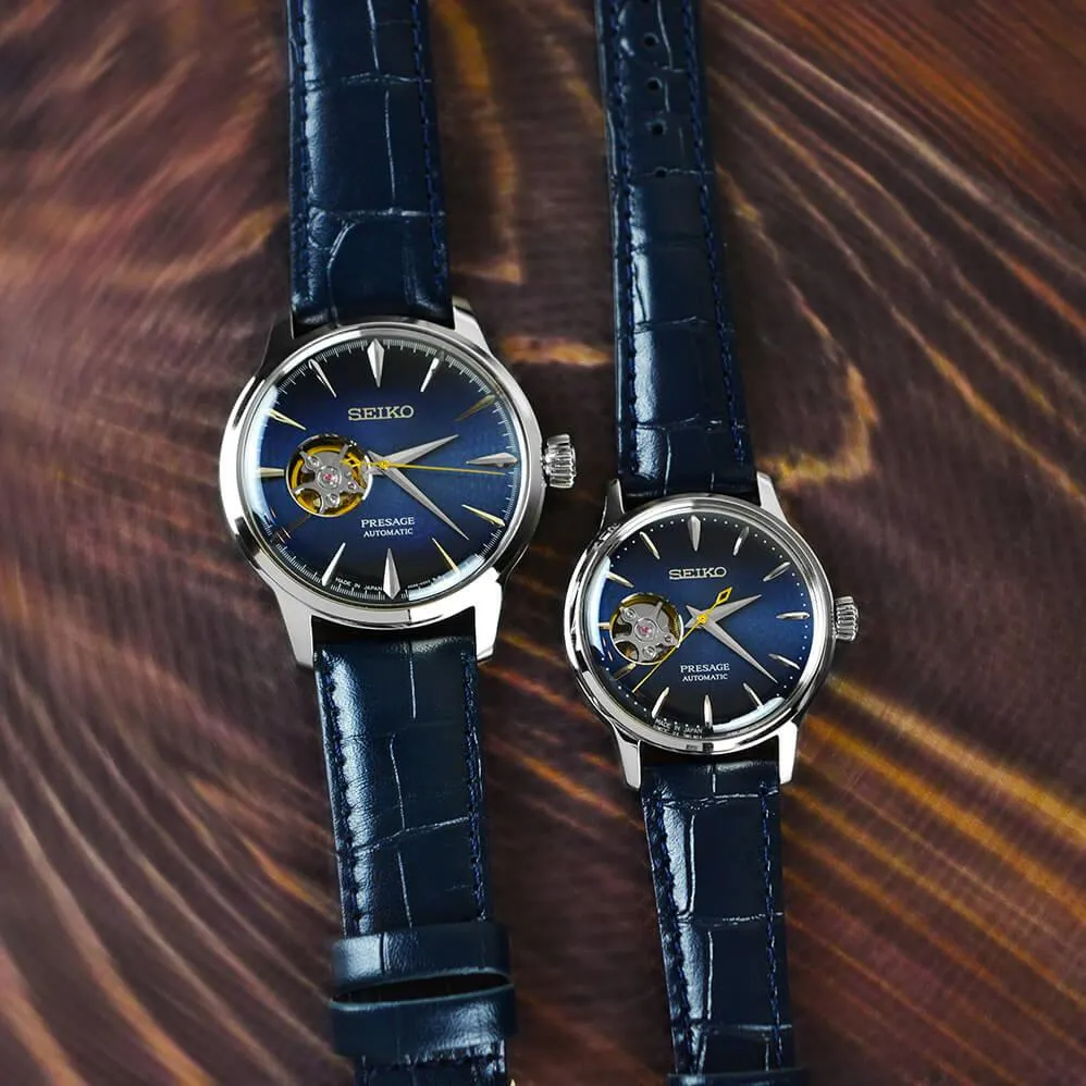 Серия Blue Moon коллекции Presage Cocktail Time. • Дизайн серии Cocktail Time разработан совместно с известным Японским барменом Шинобу Ишигаки, цвет циферблата данной модели соответствует цвету одного из его коктейлей. • Механический калибр с автоподзаводом с возможностью ручного завода. Калибр механизма 4R38 на 24 камнях. Запас хода 41 час. Центральная секундная стрелка. • Точность хода не хуже -15...+25 сек. в сутки. Функция стоп-секунда (остановка секундной стрелки для установки точного времени). • На циферблате расположено прозрачное окошко, через него частично видно работу механизма. • Установлено сферическое минеральное стекло повышенной прочности Hardlex Crystal. • Завинчивающаяся прозрачная задняя крышка часов. • Водозащита до 5 АТМ. • Синий ремешок из телячьей кожи. • Раскладывающаяся застежка.