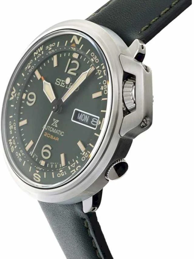 Мужские наручные часы Seiko Prospex SRPD33J1. Механические с ручным подзаводом. Ремешок изготовлен из кожи. Встроенный цифровой компас определяет северный магнитный полюс. Браслет из нержавеющей стали. Прочное, устойчивое к царапинам минеральное стекло защищает часы от повреждений. На циферблате отображается текущее число месяца и день недели. Часы являются водонепроницаемыми до 20 Бар. Цвет циферблата: Серебристый. Цвет корпуса: Зеленый. На стрелки и отметки нанесен светонакопительный состав, благодаря этому считывать информацию с циферблата возможно и в темноте. Толщина: 12 мм. Гарантия: 2 года.