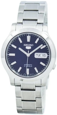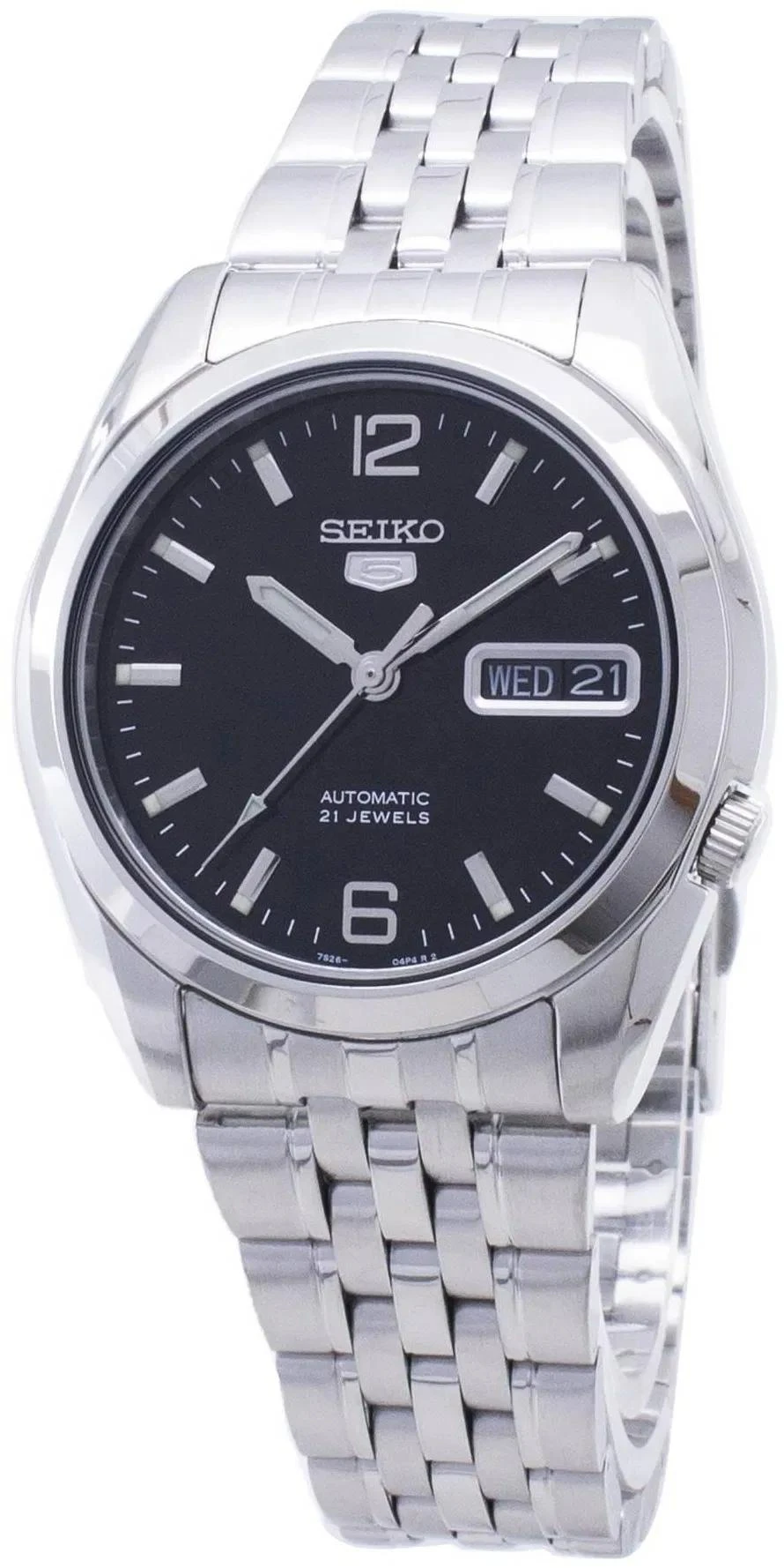 Мужские механические часы с автоподзаводом из серии Seiko 5. Круглый стальной корпус с заводной головкой в положении 4 часов. Черный циферблат. Минеральное стекло. Водозащита 30 м. Стальной браслет. Раскладывающаяся застежка.