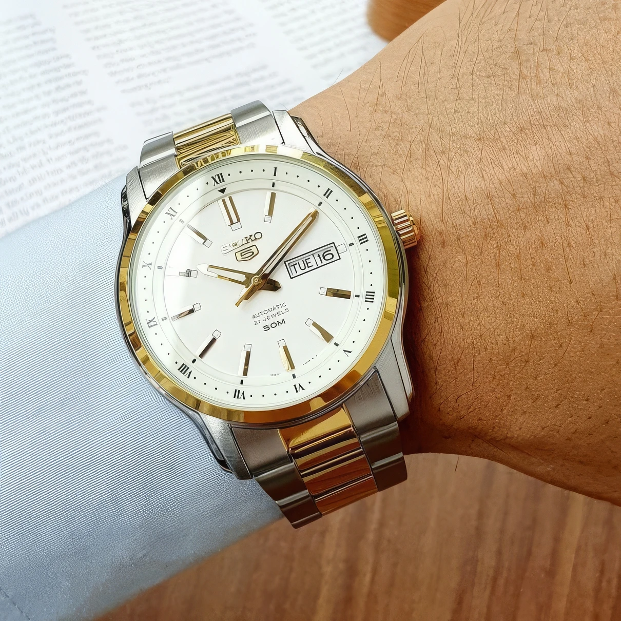 Мужские наручные часы Seiko Seiko 5 SNKP14K1. Механические с автоподзаводом. Пружина механизма заводится автоматически благодаря естественным движениям владельца в процессе ежедневной носки часов. Браслет из нержавеющей стали. Браслет из нержавеющей стали. Прочное, устойчивое к царапинам минеральное стекло защищает часы от повреждений. На циферблате отображается текущее число месяца и день недели. Часы являются водонепроницаемыми до 5 Бар. Цвет циферблата: Желтое золото. Цвет корпуса: Белый. На стрелки и отметки нанесен светонакопительный состав, благодаря этому считывать информацию с циферблата возможно и в темноте. Толщина: 11 мм. Гарантия: 2 года.