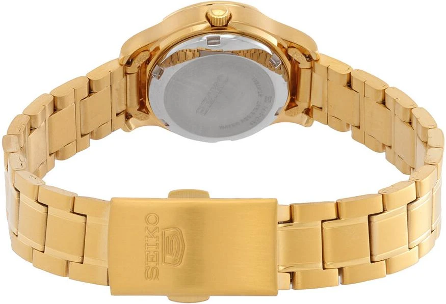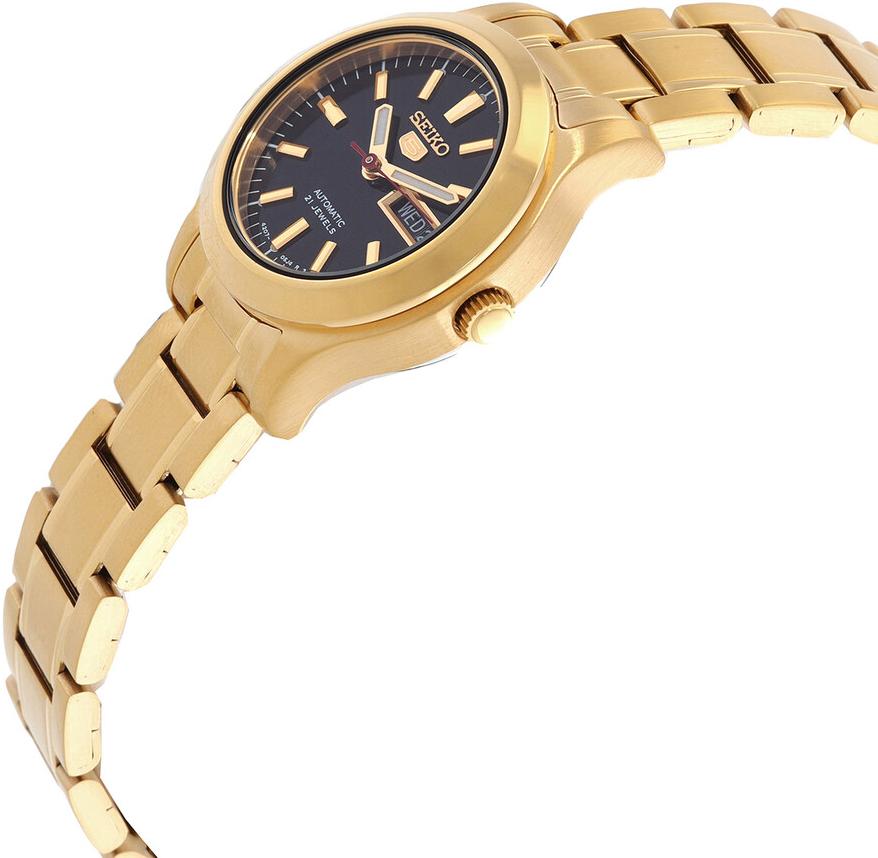 Женские наручные часы Seiko Seiko 5 SYMD96K1. Механические с автоподзаводом. Пружина механизма заводится автоматически благодаря естественным движениям владельца в процессе ежедневной носки часов. На стрелки и отметки нанесен светонакопительный состав, благодаря этому считывать информацию с циферблата возможно и в темноте. Браслет из нержавеющей стали обладает высокой прочностью и износостойкостью, обеспечивая долговечность даже при активной эксплуатации. Материал устойчив к коррозии и сохраняет свой внешний вид надолго. Корпус изготовлен из высококачественной нержавеющей стали 316L с высокими антикоррозийными свойствами. Прочное, устойчивое к царапинам минеральное стекло защищает часы от повреждений. Часы являются водонепроницаемыми до 3 Бар. Цвет корпуса: Желтое золото. Цвет циферблата: Черный. Высота (с ушками): 26 мм. Толщина: 11 мм. Гарантия: 2 года.