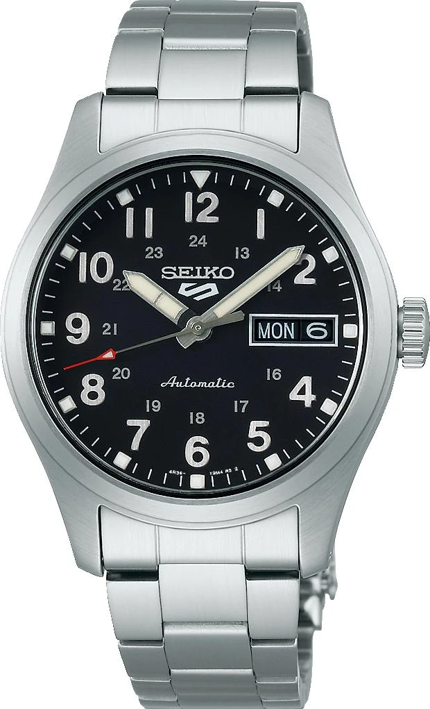 Мужские наручные часы Seiko Seiko 5 Sports SRPJ81K1. Механические с автоподзаводом. Пружина механизма заводится автоматически благодаря естественным движениям владельца в процессе ежедневной носки часов. Браслет из нержавеющей стали. Браслет из нержавеющей стали. Прочное, устойчивое к царапинам минеральное стекло защищает часы от повреждений. На циферблате отображается текущее число месяца и день недели. Часы являются водонепроницаемыми до 10 Бар. Цвет циферблата: Серебристый. Цвет корпуса: Черный. На стрелки и отметки нанесен светонакопительный состав, благодаря этому считывать информацию с циферблата возможно и в темноте. Толщина: 13 мм. Гарантия: 2 года.