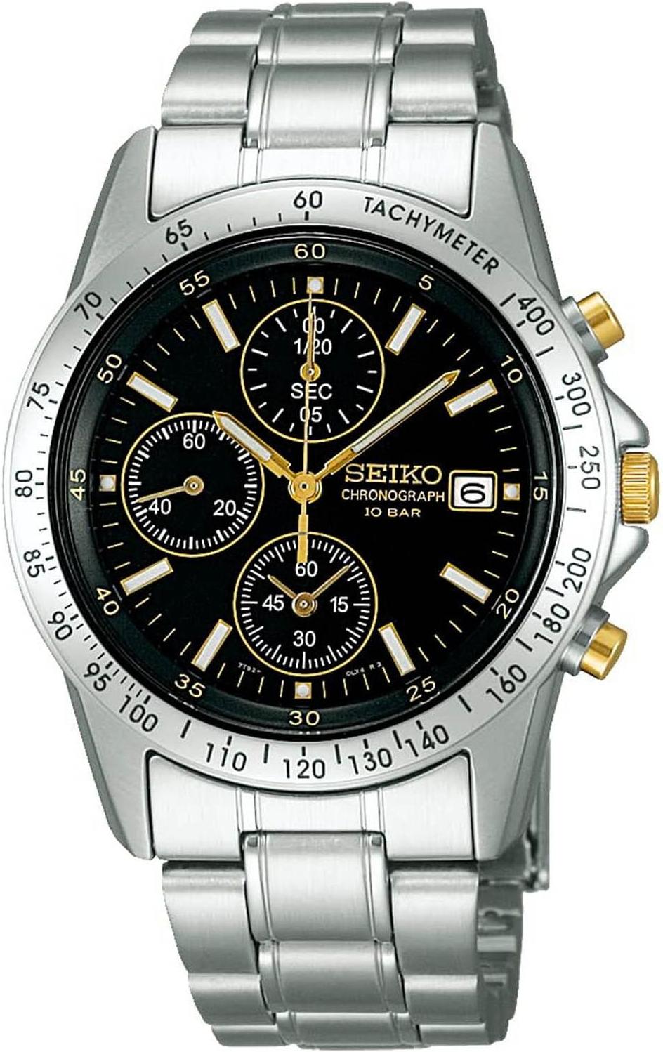 Мужские наручные часы Seiko Spirit SBTQ043. Точный кварцевый механизм с аналоговой индикацией. В отличие от механических часов, не требуют завода и работают от батареи, показывая отклонение всего несколько секунд в месяц. На стрелки и отметки нанесен светонакопительный состав, благодаря этому считывать информацию с циферблата возможно и в темноте. Браслет из нержавеющей стали обладает высокой прочностью и износостойкостью, обеспечивая долговечность даже при активной эксплуатации. Материал устойчив к коррозии и сохраняет свой внешний вид надолго. Функция хронографа. Корпус изготовлен из высококачественной нержавеющей стали 316L с высокими антикоррозийными свойствами. Прочное, устойчивое к царапинам минеральное стекло защищает часы от повреждений. Часы являются водонепроницаемыми до 10 Бар. Цвет корпуса: Серебристый. Цвет циферблата: Черный. Высота (с ушками): 38.5 мм. Толщина: 9.6 мм. Гарантия: 2 года.