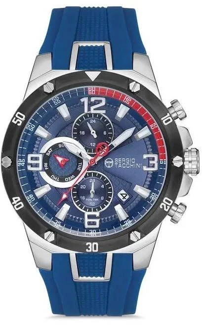 <b>Мужские наручные часы Sergio Tacchini Coastlife ST.1.10138-2.</b> Точный кварцевый механизм с аналоговой индикацией. Корпус изготовлен из высококачественной нержавеющей стали 316L с высокими антикоррозийными свойствами. На стрелки и отметки нанесен светонакопительный состав, благодаря этому считывать информацию с циферблата возможно и в темноте. На циферблате отображается текущее число месяца и день недели. Функция хронографа. Отображение времени возможно в 12-часовом или 24-часовом формате. Силиконовый ремешок. Прочное, устойчивое к царапинам минеральное стекло защищает часы от повреждений. Часы являются водонепроницаемыми до 5 Бар. Цвет корпуса: Черный. Цвет циферблата: Синий. Гарантия: 2 года.