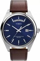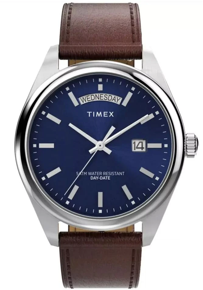 Эти классические мужские часы в круглом корпусе 41 мм из нержавеющей стали сочетают стиль и функциональность. Модель с изящным синим циферблатом и серебристыми стрелками дополнена удобными календарными функциями — указателем даты на позиции "3 часа" и дня недели на "12 часах". Устойчивое к царапинам минеральное стекло, фиксированный серебристый безель и элегантный коричневый кожаный ремешок завершают образ этого надёжного аксессуара с кварцевым механизмом.