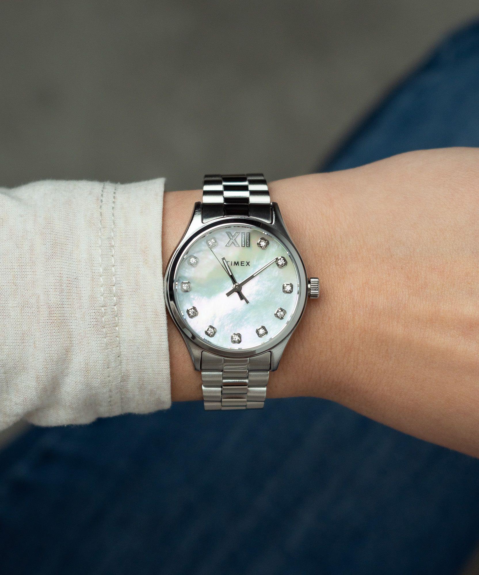 Корпус из латуни с низким содержанием свинца серебристого оттенка с браслетом из нержавеющей стали серебристого оттенка. Фиксированный безель из латуни с низким содержанием свинца серебристого оттенка. Перламутровый циферблат с серебристыми стрелками и хрустальными часовыми метками. Тип циферблата: аналоговый. Люминесцентные стрелки. Кварцевый механизм. Минеральное стекло, устойчивое к царапинам. Заводная головка с выдвижным/нажимным механизмом. Цельная задняя крышка. Круглая форма корпуса, размер корпуса: 34 мм, толщина корпуса: 9 мм. Ширина ремешка: 16 мм. Раскрытие с помощью застежки-кнопки. Водонепроницаемость до 50 метров