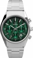 Корпус и браслет из серебристой нержавеющей стали. Фиксированный серебристый безель из нержавеющей стали. Зеленый циферблат с серебристыми стрелками и часовыми метками. Тип циферблата: аналоговый. Отображение даты между 4 и 5 часами. Хронограф - три дополнительных циферблата, отображающие: 60 секунд, 60 минут и 24 часа. Кварцевый механизм. Заводная головка с выдвижным/нажимным механизмом. Круглая форма корпуса, размер корпуса: 40 мм, толщина корпуса: 12 мм. Ширина ремешка: 18 мм. Раскладывающаяся застежка. Водонепроницаемость до 50 метров