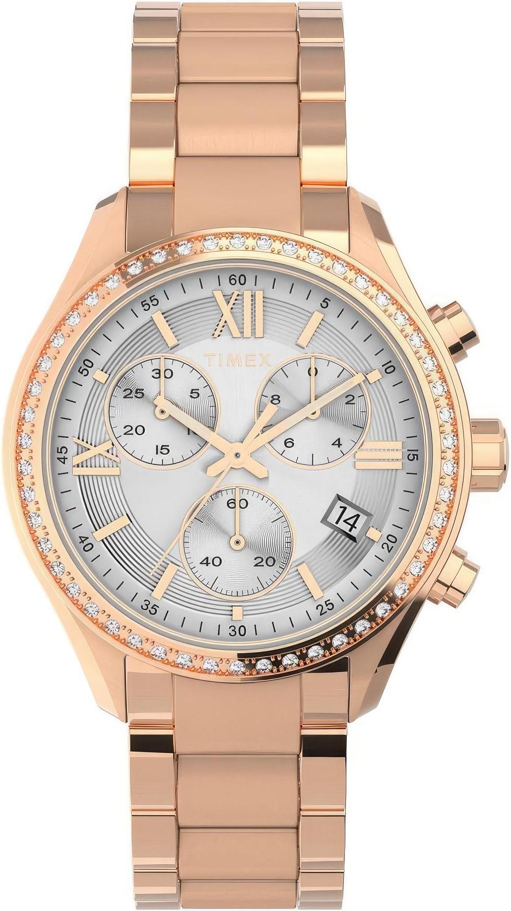 Женские наручные часы Timex Elevated Classics TW2V57900. Точный кварцевый механизм с аналоговой индикацией. Корпус изготовлен из высококачественной нержавеющей стали 316L с высокими антикоррозийными свойствами. На стрелки и отметки нанесен светонакопительный состав, благодаря этому считывать информацию с циферблата возможно и в темноте. На циферблате отображается текущее число месяца. Функция хронографа. Браслет из нержавеющей стали. Прочное, устойчивое к царапинам минеральное стекло защищает часы от повреждений. Часы являются водонепроницаемыми до 3 Бар. Цвет корпуса: Розовое золото. Цвет циферблата: Серебристый. Ширина (с заводной головкой): 38мм. Толщина: 12мм. Гарантия: 2 года.