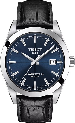 Выбирая оригинальные часы, обратите внимание на Tissot Gentleman Powermatic 80 Silicium — идеальный повседневный и стильный аксессуар, который станет прекрасным дополнением к любому образу. Эти мужские часы имеют круглую форму корпуса, выполненного из нержавеющей стали 316L, и оснащены прозрачной задней крышкой, позволяющей любоваться работой часов. Диаметр корпуса составляет 40 мм, а толщина — 11,5 мм, при весе 87 г. Часы оснащены швейцарским автоматическим механизмом с калибром 11 1/2''' (диаметр 25,6 мм) и запасом хода до 80 часов, а также запатентованной кремниевой пружиной баланса. Водонепроницаемость 100 метров (10 АТМ/bar): подходят для плавания и погружения на глубину 5-7 м (выдвигать заводную головку и нажимать кнопки, находясь в воде, нельзя). Модель защищена куполообразным, устойчивым к царапинам сапфировым стеклом с антибликовым покрытием. На синем циферблате расположены индексы, а на стрелках — люминесцентное покрытие Super-LumiNova. Часы комплектуются черным кожаным ремешком с раскладывающейся застежкой-бабочкой с кнопками, длина которого составляет 120 мм со стороны 6 часов и 75 мм со стороны 12 часов.