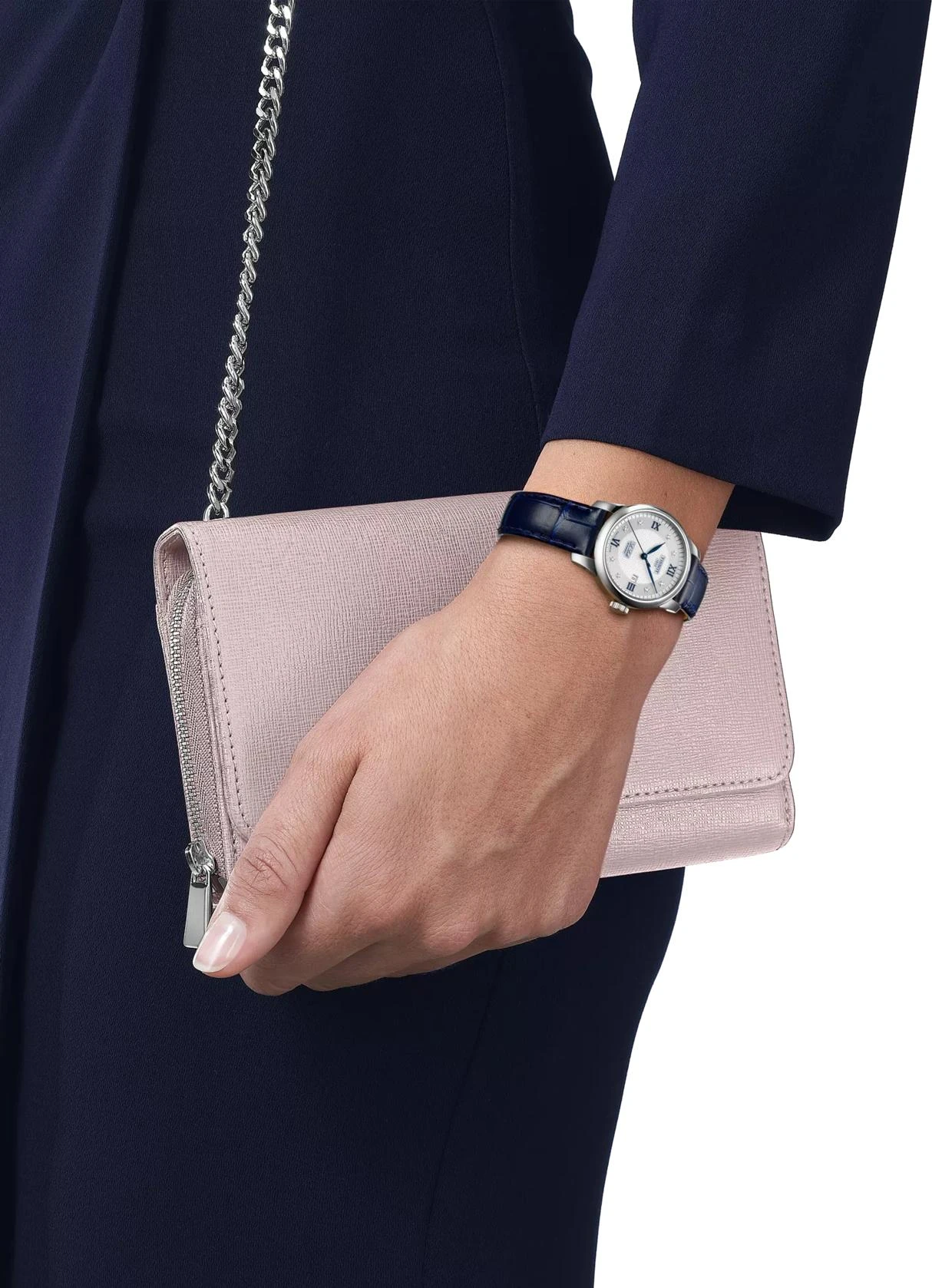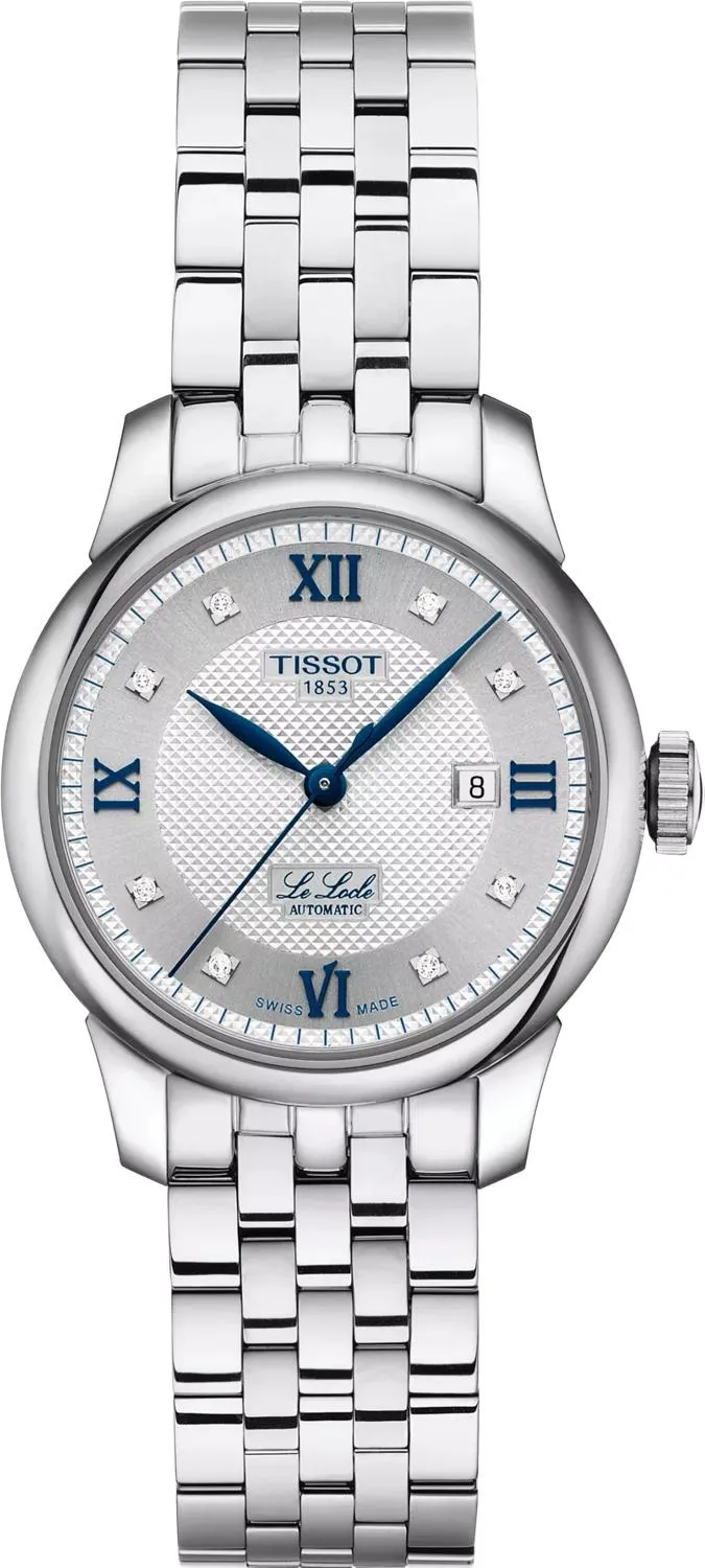 Откройте для себя элегантность и наследие с моделью Tissot Le Locle Automatic Lady (29.00) 20th Anniversary — уникальными женскими часами, артикул которых T006.207.11.036.01. Названные в честь родного города Tissot в Швейцарских горах Юра, эти часы являются юбилейным, двадцатым, изданием коллекции Le Locle, запущенной в 2003 году к 150-летию бренда, воплощая его богатые традиции часового мастерства. Эти оригинальные часы из Швейцарии имеют круглый корпус диаметром 29 мм и толщиной 8,95 мм, изготовленный из нержавеющей стали 316L, а их вес составляет 77 г. Сквозь прозрачную заднюю крышку можно наблюдать за слаженной работой швейцарского автоматического механизма калибра 7 3/4''' с запатентованной спиралью баланса Nivachron, которая устойчива к воздействию магнитных полей, и запасом хода до 48 часов. Защиту циферблата обеспечивает устойчивое к царапинам сапфировое стекло. Серебристый циферблат украшен синими римскими цифрами в позициях 12, 3, 6 и 9 часов, окошком даты, а также восемью бриллиантами (0,03 карата, цвет Top Wesselton, чистота VS-SI, огранка 8/8 Single cut), служащими часовыми индексами. Водозащита 30 метров (3 АТМ/bar): минимальная защита от мелких брызг. Часы не предназначены для погружения в воду. В комплекте с часами поставляются два ремешка/браслета, которые можно легко и быстро заменить без использования инструментов благодаря системе быстрой замены: браслет из нержавеющей стали серого цвета и дополнительный темно-синий кожаный ремешок, что позволяет адаптировать внешний вид изделия под любой образ.