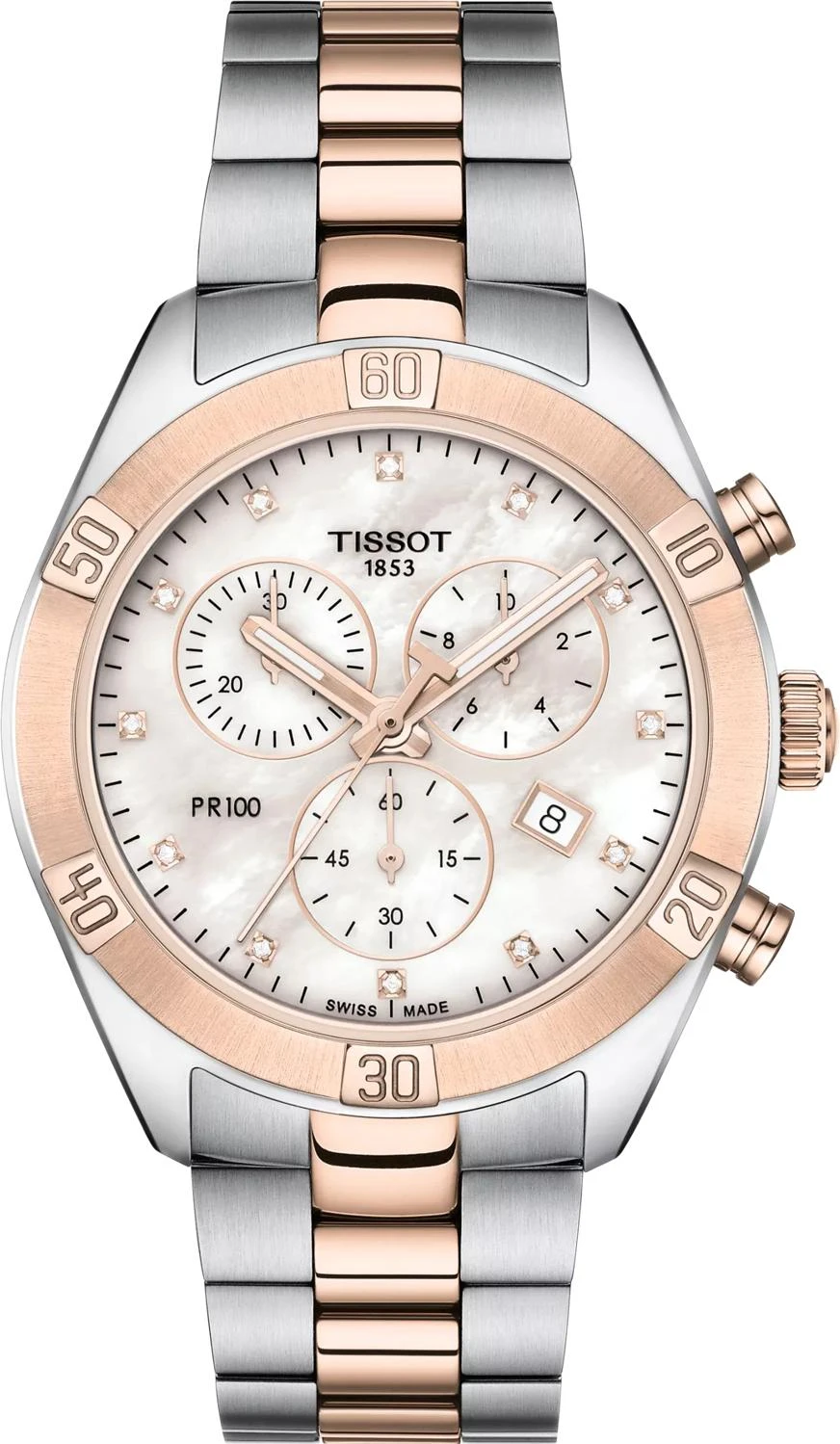 Женские наручные часы Tissot PR 100 T101.917.22.116.00. Точный кварцевый механизм с аналоговой индикацией. Корпус изготовлен из высококачественной нержавеющей стали 316L с высокими антикоррозийными свойствами. На стрелки и отметки нанесен светонакопительный состав, благодаря этому считывать информацию с циферблата возможно и в темноте. На циферблате отображается текущее число месяца. Функция хронографа. Браслет из нержавеющей стали. Сапфировое стекло. Искусственно изготовленное стекло с высокой прочностью и устойчивостью к царапинам. Часы являются водонепроницаемыми до 10 Бар. Цвет корпуса: Серебристый. Цвет циферблата: Розовый. Гарантия: 2 года.
