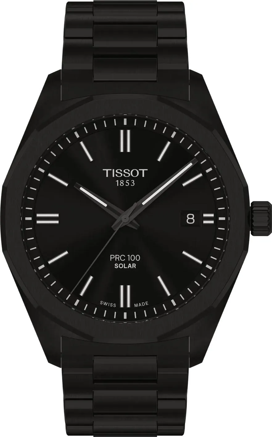 Мужские часы Tissot PRC 100 Solar Quartz 39mm, произведенные в Швейцарии, являются образцом надежности и стиля, завоевавшим признание с момента первого выпуска в середине 2000-х годов благодаря своему яркому дизайну и инновациям в коллекции Tissot. Сегодня они возвращаются с новаторским механизмом Lightmaster Solar Quartz, который использует фотоэлектрическую энергию для питания. Эти швейцарские часы с кварцевым солнечным механизмом, калибром 11 1/2''' диаметром 25,6 мм, который питается от аккумулятора типа Panasonic CTL920F. Корпус круглой формы диаметром 39 мм и толщиной 9,22 мм выполнен из нержавеющей стали 316L с черным PVD-покрытием и двенадцатиугольным безелем. Под гладким устойчивым к царапинам сапфировым стеклом находится циферблат черного цвета с индексами, разработанный для легкой подзарядки от естественного и искусственного света, а люминесцентное покрытие Super-LumiNova на стрелках обеспечивает отличную читаемость. Индикатор окончания запаса энергии гарантирует оптимальную производительность. При весе 128 г эти часы обладают водонепроницаемостью 100 метров (10 АТМ/bar): подходят для плавания и погружения на глубину 5–7 м (выдвигать заводную головку и нажимать кнопки, находясь в воде, нельзя). Черный браслет из нержавеющей стали с PVD-покрытием оснащен застежкой-бабочкой с кнопками, а возможность быстрой смены позволяет легко персонализировать свой стиль.
