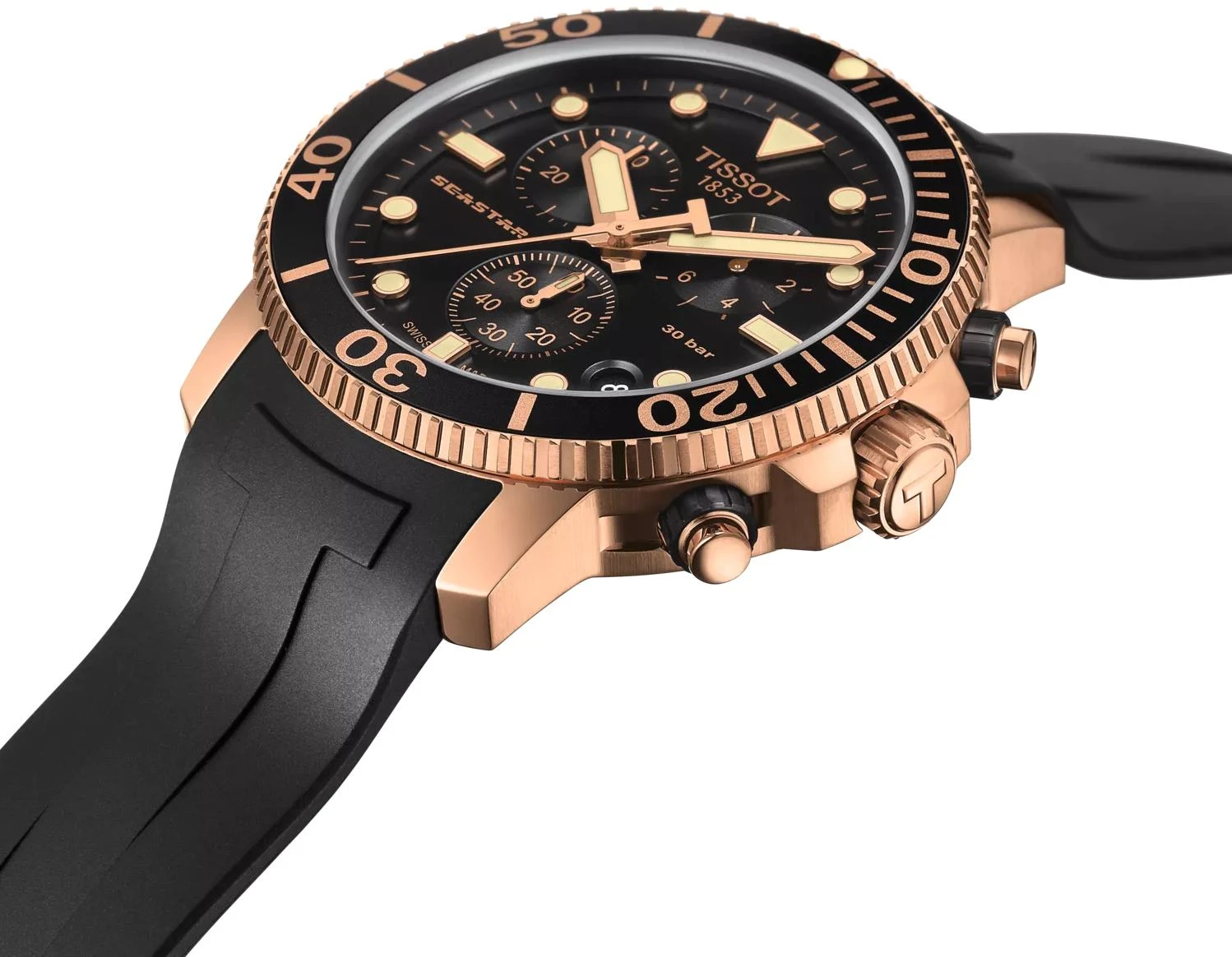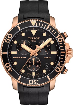 Мужские оригинальные часы Tissot Seastar 1000 Chronograph представляют собой идеальное слияние стиля и производительности без каких-либо компромиссов. Вдохновленный дайвингом, этот швейцарский аксессуар формирует как внешний вид, так и функциональность, сохраняя свою эффективность при давлении до 30 бар (300 м). Это сочетание подводного спорта и предпочтения утонченному стилю. Часы имеют круглую форму корпуса 45,5 x 45,5 мм и толщиной 12,82 мм, при этом вес составляет 109 г. Корпус выполнен из нержавеющей стали 316L с PVD-покрытием цвета розового золота, дополнен алюминиевым безелем с вращением против часовой стрелки, завинчивающейся заводной головкой, задней крышкой и кнопками. Циферблат черного цвета с индексами защищен устойчивым к царапинам сапфировым стеклом с двусторонним антибликовым покрытием. В часах используется швейцарский кварцевый механизм калибра 13 1/4''' (диаметр 29,8 мм) с индикатором заряда батареи EOL, оснащенный батареей типа Renata 394. Функционал включает хронограф с 30-минутным и 1/10-секундным счетчиками, центральной 60-секундной стрелкой и функциями ADD/SPLIT. Стрелки и индексы покрыты люминесцентным составом Super-LumiNova. Уровень водозащиты 300 метров (30 АТМ/bar): можно плавать, погружаться с аквалангом на глубину 70 метров. Ремень из каучука черного цвета с классической застежкой имеет крепление 22 мм. Тема дайвинга прослеживается в деталях: однонаправленный безель, ремешок с безопасной застежкой для дайверов, а также люминесцентные стрелки и маркировка.