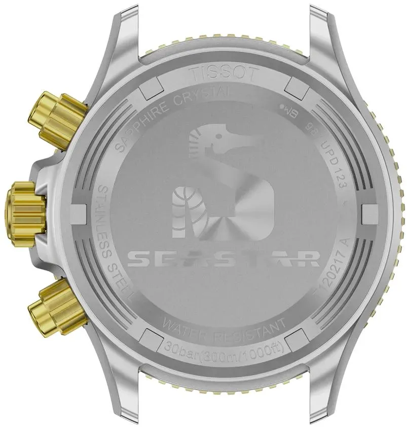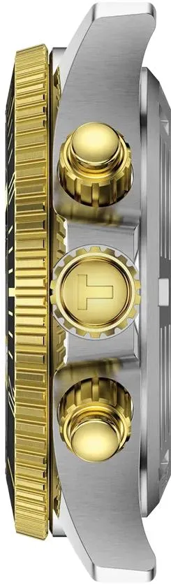 Мужские часы Tissot Seastar 1000 Quartz Chronograph 38mm — это идеальное сочетание спортивного стиля и надежности, рожденное из богатого наследия коллекции. Эти оригинальные часы станут превосходным дополнением к любому образу и спутником в самых разных приключениях. Корпус диаметром 38 мм, толщиной 12,95 мм и весом 131 г выполнен из нержавеющей стали 316L с PVD-покрытием цвета желтого золота. Механизм — швейцарский кварц с калибром 10 1/2''' и индикатором заряда батареи EOL, работающий от батареи Renata 394. Часы оснащены хронографом с центральной 60-секундной стрелкой, 30-минутным и 1/10-секундным счетчиками, а также функциями ADD и SPLIT для точного измерения времени. Циферблат градиентного серо-черного цвета с индексами и люминесцентным покрытием Super-LumiNova на стрелках обеспечивает отличную читаемость даже в условиях недостаточного освещения. Модель имеет минеральный безель, вращающийся против часовой стрелки, завинчивающиеся заводную головку и заднюю крышку, а также кнопки хронографа. Защиту циферблата обеспечивает устойчивое к царапинам сапфировое стекло с двусторонним антибликовым покрытием. Ремешок из нержавеющей стали с PVD-покрытием серого цвета и желтого золота 1N14 снабжен складной застежкой с предохранителем и кнопками, а также функцией быстрой замены. Обладают водонепроницаемостью до 30 бар (300 м): можно плавать, погружаться с аквалангом на глубину 70 метров.