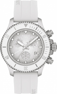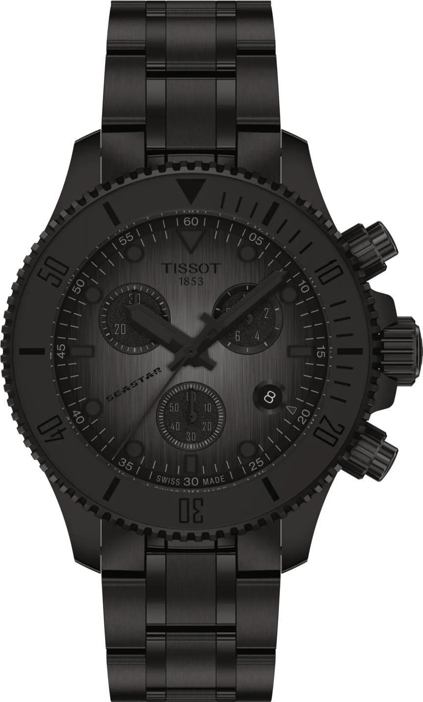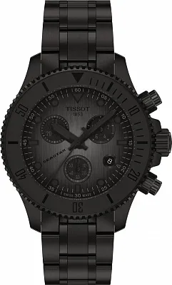 Выбирая оригинальные часы Tissot Seastar 1000 Quartz Chronograph 38mm, вы получаете надежный и стильный аксессуар, рожденный из наследия коллекции. Эти мужские часы в новом исполнении 38-миллиметрового кварцевого хронографа выражают фирменную индивидуальность коллекции, привнося точность в движение и характер в каждую деталь. Корпус из нержавеющей стали 316L с черным PVD-покрытием имеет круглую форму, длину 38 мм, ширину 38 мм и толщину 12,95 мм, а крепление ремешка (ушки) составляет 18 мм. Модель оснащена швейцарским кварцевым механизмом, калибр 10 1/2''' (23,3 мм в диаметре), имеет индикатор заряда батареи (EOL) и питается от батареи Renata 394. Функции хронографа включают 30-минутный и 1/10-секундный счетчики, центральную 60-секундную стрелку хронографа, а также функции ADD и SPLIT. Стойкое к царапинам сапфировое стекло с двусторонним антибликовым покрытием защищает циферблат градиентного серо-черного цвета с индексами. Люминесцентный материал Super-LumiNova на стрелках обеспечивает читаемость в условиях недостаточной освещенности. Опции корпуса включают минеральный безель, вращающийся против часовой стрелки, завинчивающуюся заводную головку и заднюю крышку, а также завинчивающиеся кнопки. Часы весят 131 г и комплектуются черным браслетом из нержавеющей стали с PVD-покрытием и раскладывающейся застежкой с системой безопасности, кнопками и функцией быстрой замены. Водозащита до давления 30 бар (300 м / 1000 футов) означает, что эти швейцарские часы подходят для плавания и погружения с аквалангом на глубину 70 метров.