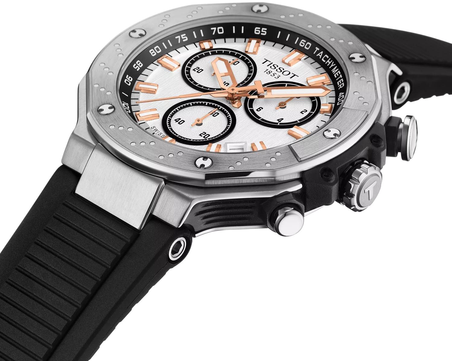 Встречайте мужские Tissot T-Race Chronograph — оригинальные часы с обновленным дизайном, который обрел более элегантный циферблат, сохранив при этом спортивные корни коллекции. Подобно мотоспорту, бренд Tissot объединяет страсть, инновации и стиль. Коллекция вдохновлена этим образом жизни — свободой, открытой дорогой и страстью: это выбор джентльмена-байкера. Эти швейцарские часы с кварцевым хронографом постоянно напоминают о духе механической среды. Например, тормозной диск и калибр изображены на безеле, кнопки вдохновлены рулем, а ребра охлаждения двигателя — на боковой части корпуса. Корпус часов выполнен из нержавеющей стали 316L, имеет круглую форму с размерами 45x45 мм и толщиной 11,76 мм. Вес модели составляет 114 г. Механизм — швейцарский кварцевый EOL (с индикатором заряда батареи), калибр 13 1/4''' (диаметр 29,8 мм), батарея типа Renata 394. Функции включают счетчики 30 минут и 1/10 секунды, центральную 60-секундную стрелку хронографа, функции ADD и SPLIT. Циферблат белого цвета с индексами, стрелки покрыты люминесцентным материалом Super-LumiNova. Стекло — устойчивый к царапинам сапфировый кристалл с антибликовым покрытием. Ремешок силиконовый черного цвета со стандартной застежкой, длина 77/117 мм. Водонепроницаемость: 100 метров (10 АТМ/bar): подходят для плавания и погружения на глубину 5-7 м (выдвигать заводную головку и нажимать кнопки, находясь в воде, нельзя).