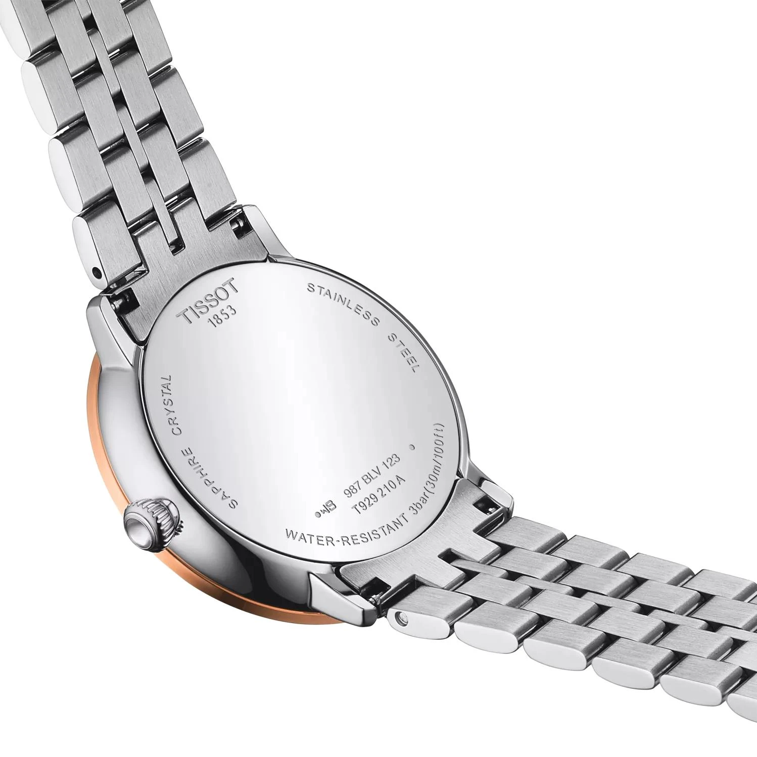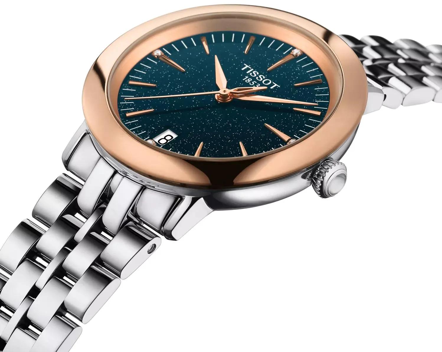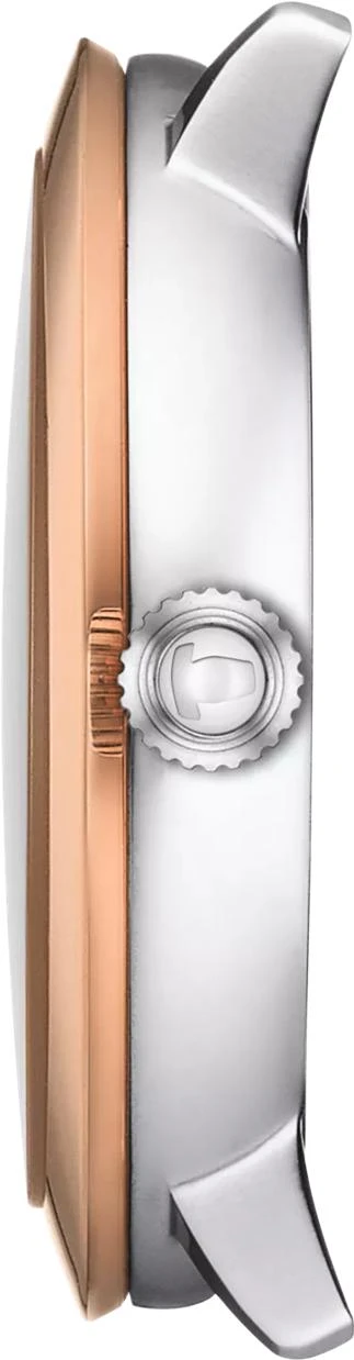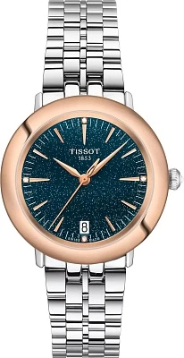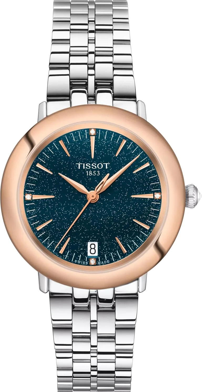 Элегантные и оригинальные часы Tissot Glendora 18k Gold (артикул T929.210.41.046.00) — это истинное ювелирное изделие, созданное для активных женских часов и желающих выразить свое изящное очарование через роскошный, но современный аксессуар. Это швейцарские часы, корпус которых выполнен из нержавеющей стали 316L, а безель из чистого 18-каратного розового золота, подчеркивает их современный дизайн и изысканность. Заводная головка имеет драгоценное оформление в виде кабошона-пирамиды, а противовес секундной стрелки скелетонизирован. Круглый корпус имеет длину 33 мм, ширину 33 мм и толщину 7,57 мм, ушки 16 мм, а общий вес изделия составляет 72,2 г. Сердцем модели является точный швейцарский кварцевый механизм с калибром 10 1/2''' и функцией EOL (индикатором заряда батареи), который работает от элемента питания Renata 371. Синий циферблат защищен устойчивым к царапинам сапфировым стеклом и украшен накладными индексами и бриллиантами (4 штуки общим весом 0,01 карат, чистота VS-SI, цвет Top Wesselton, огранка Single cut 8/8). Модель укомплектована браслетом из нержавеющей стали серого цвета с застежкой-бабочкой с кнопками. Водонепроницаемость часов составляет 30 метров (3 АТМ/bar): минимальная защита от мелких брызг. Часы не предназначены для погружения в воду.