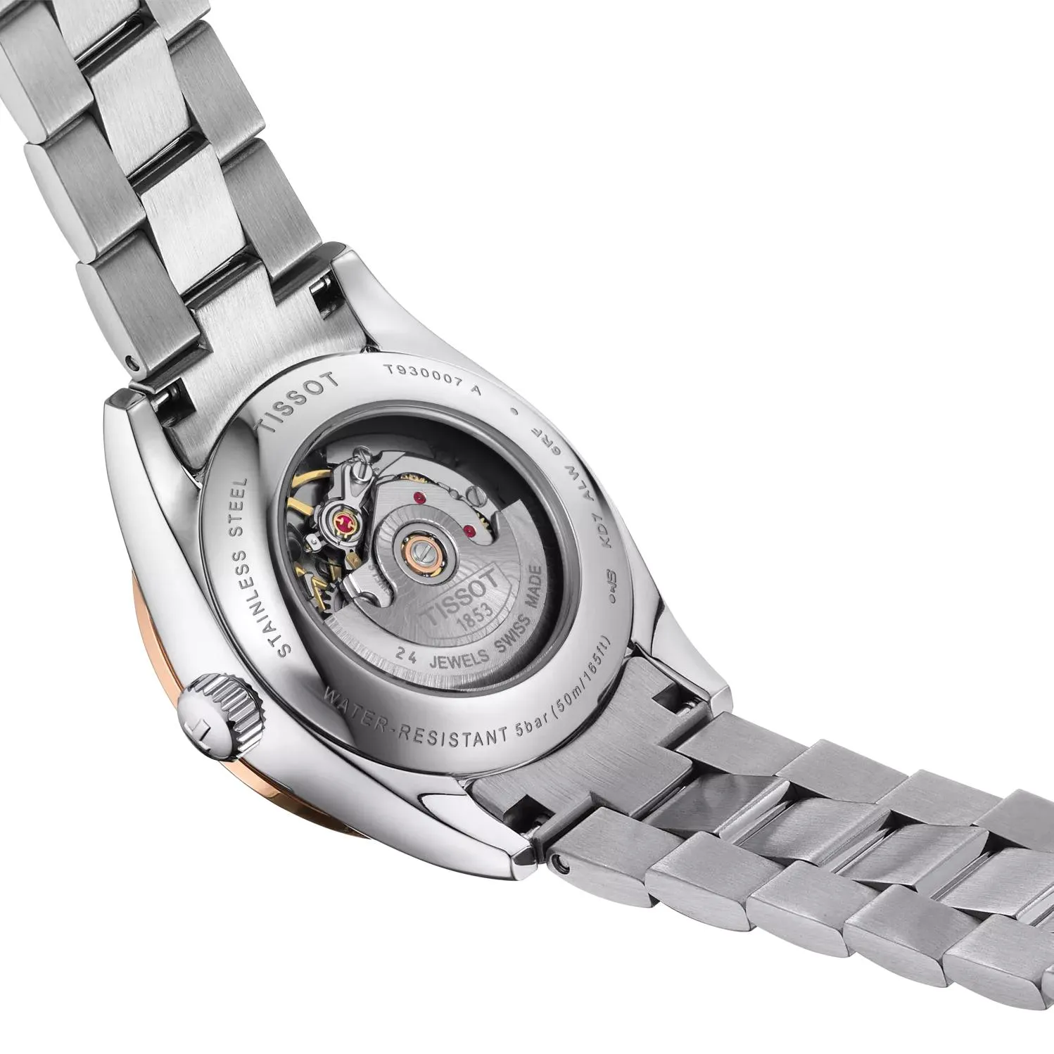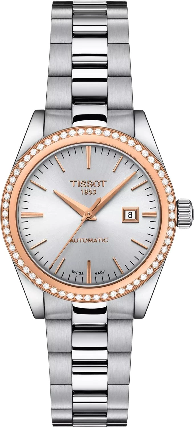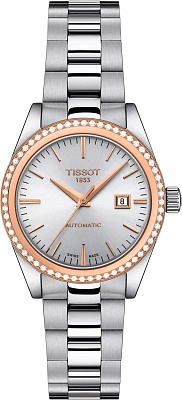 Откройте для себя очарование и элегантность с моделью Tissot T-My Lady Gold 29mm — это по-настоящему оригинальные часы, созданные для женщин, которые видят в часах не просто аксессуар, а спутника в жизненном путешествии, ценя изысканность и надежность. Эти женские часы артикула T930.007.41.031.00 из самой Швейцарии воплощают концепцию идеального повседневного спутника для леди, элегантных, утонченных или деловых женщин. Круглый корпус диаметром 29 мм и толщиной 10,35 мм выполнен из высококачественной нержавеющей стали 316L, а безель инкрустирован 60 бриллиантами (0,39 карата, чистота VS-SI, цвет Top Wesselton, огранка 32/24 Full Cut) и изготовлен из 18-каратного полированного розового золота. Сквозь прозрачную заднюю крышку можно наблюдать за работой швейцарского автоматического механизма с запасом хода до 48 часов, оснащенного запатентованной спиралью баланса Nivachron, что обеспечивает исключительную устойчивость к магнитным полям. Вес изделия составляет всего 84 г, а водонепроницаемость до давления 5 бар (50 м) означает, что часы выдерживают мытье рук, попадание крупных капель. Серебристый циферблат с индексами защищен устойчивым к царапинам сапфировым стеклом. Браслет из нержавеющей стали серого цвета оснащен застежкой-бабочкой с кнопками — все это делает эти швейцарские часы воплощением непреходящей классики и современных технологий.