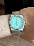 Представляем вашему вниманию оригинальные часы Tissot PRX 40mm — стильную мужскую модель, корпус которой имеет форму бочки и выполнен из нержавеющей стали 316L, а ширина составляет 40,0 мм при толщине 10,4 мм, с расстоянием между ушками 12,0 мм. Внутри этих швейцарских часов установлен надежный кварцевый механизм Swiss quartz калибра 11 1/2''' с диаметром 25,6 мм и функцией EOL (индикатор заряда батареи), который работает от батареи Renata 371, обеспечивая точность хода. Циферблат светло-зеленого цвета оснащен индексами, а стрелки покрыты люминесцентным материалом Super-LumiNova. Защиту циферблата обеспечивает устойчивое к появлению царапин сапфировое стекло. Водонепроницаемость составляет 100 метров (10 АТМ/bar): они подходят для плавания и погружения на глубину 5-7 м (выдвигать заводную головку и нажимать кнопки, находясь в воде, нельзя). Модель дополнена серым браслетом из нержавеющей стали с быстросъемной системой и застежкой-бабочкой с кнопками, что делает ношение максимально комфортным. Tissot PRX T137.410.11.091.01 — это часы, которые прекрасно сочетают в себе стиль и функциональность; эта модель основывается на оригинальной модели Tissot PRX, которая была создана в 1978 году и была первой в своем роде благодаря кварцевому механизму, который обеспечивает точность и надежность хода.