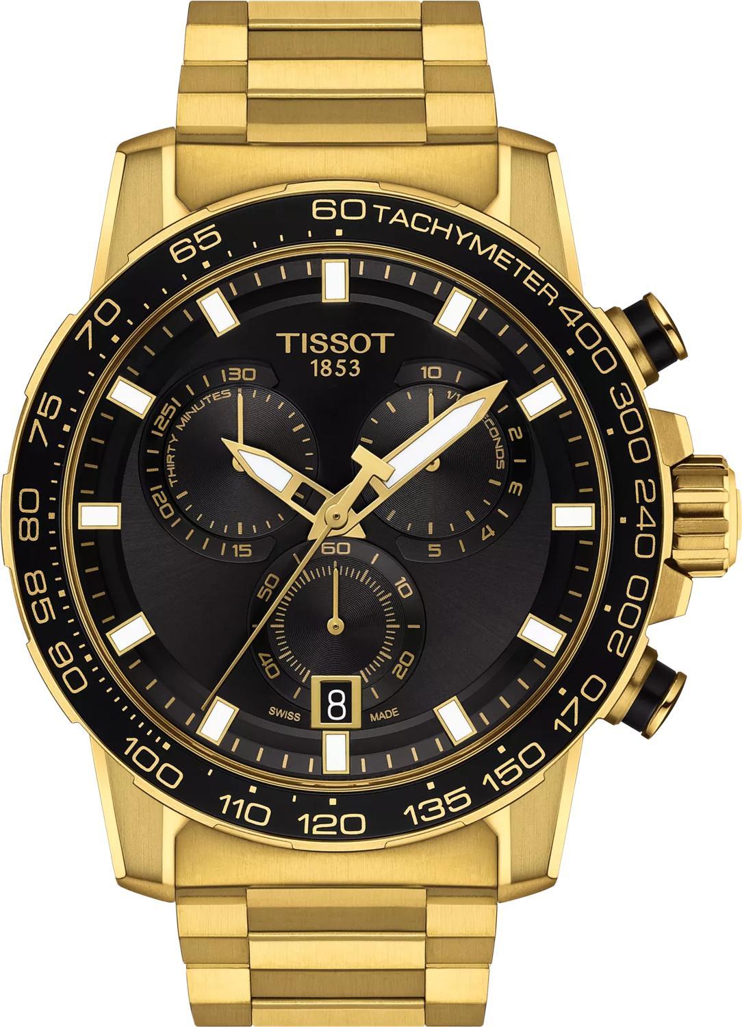 Вы ищете по-настоящему оригинальные часы? Мужские Tissot Supersport Chrono — это выбор для тех, кто ценит спортивный стиль и безупречное качество, которым славятся швейцарские часы. Модель обладает сильным характером благодаря четким линиям, острым контурам и крупному корпусу диаметром 45,5 мм при толщине 11,92 мм. Внутри находится надежный швейцарский кварцевый механизм с функциями хронографа: 30-минутный и 1/10-секундный счетчики, центральная 60-секундная стрелка хронографа, а также функции EOL (индикация окончания срока службы батареи), ADD и SPLIT. Корпус выполнен из высококачественной нержавеющей стали 316L с покрытием PVD цвета желтого золота, дополненным алюминиевым безелем. Черный циферблат с контрастными стрелками и индексами цвета желтого золота, покрытыми составом Super-LumiNova для отличной читаемости в темноте, защищен устойчивым к царапинам сапфировым стеклом. Эти часы весом 188 г оснащены стальным браслетом с PVD-покрытием цвета желтого золота и раскладной застежкой с фиксатором и удлинением для дайвинга, а также системой быстрой замены. Что касается водозащиты, они выдерживают давление 100 метров (10 АТМ/bar): подходят для плавания и погружения на глубину 5-7 м (выдвигать заводную головку и нажимать кнопки, находясь в воде, нельзя).