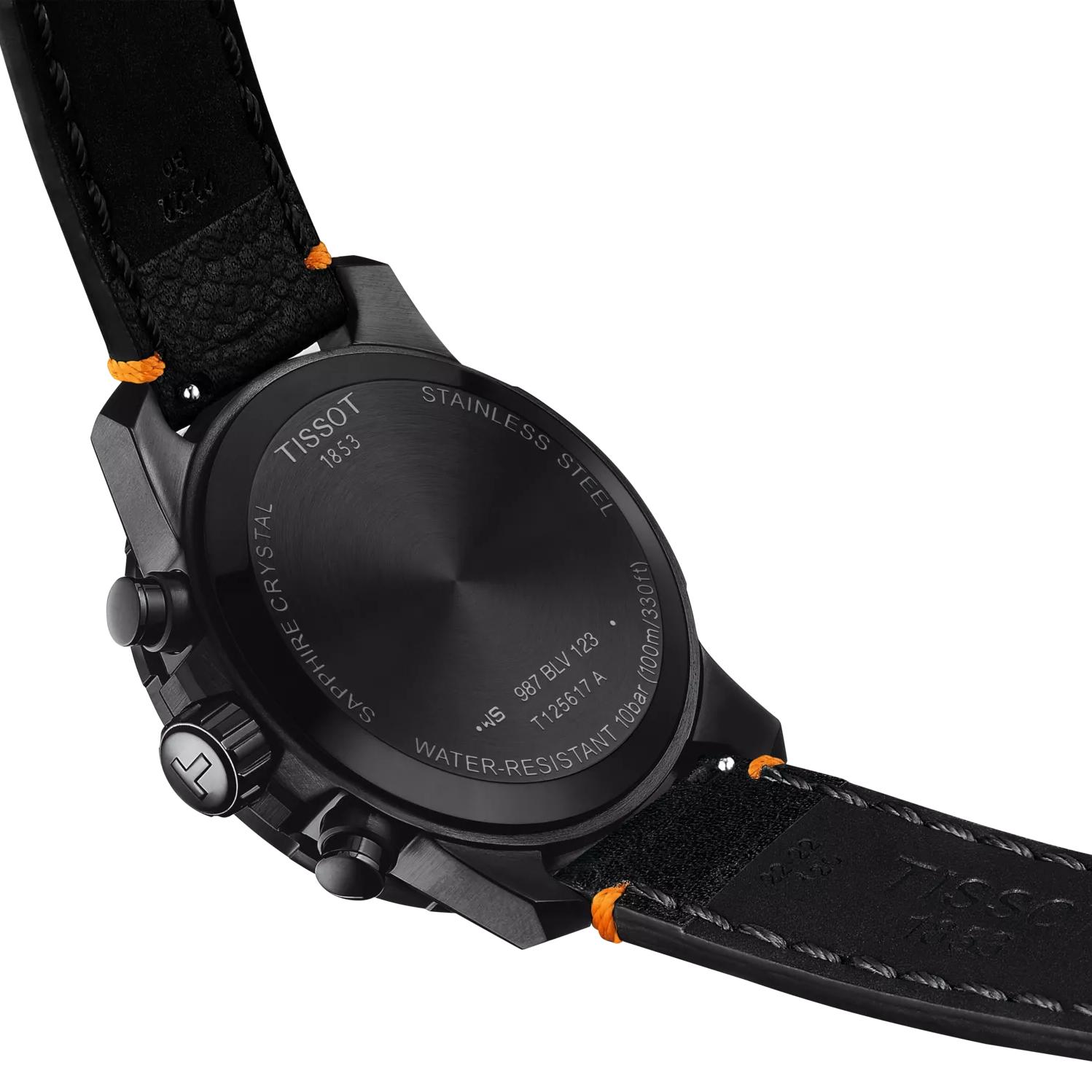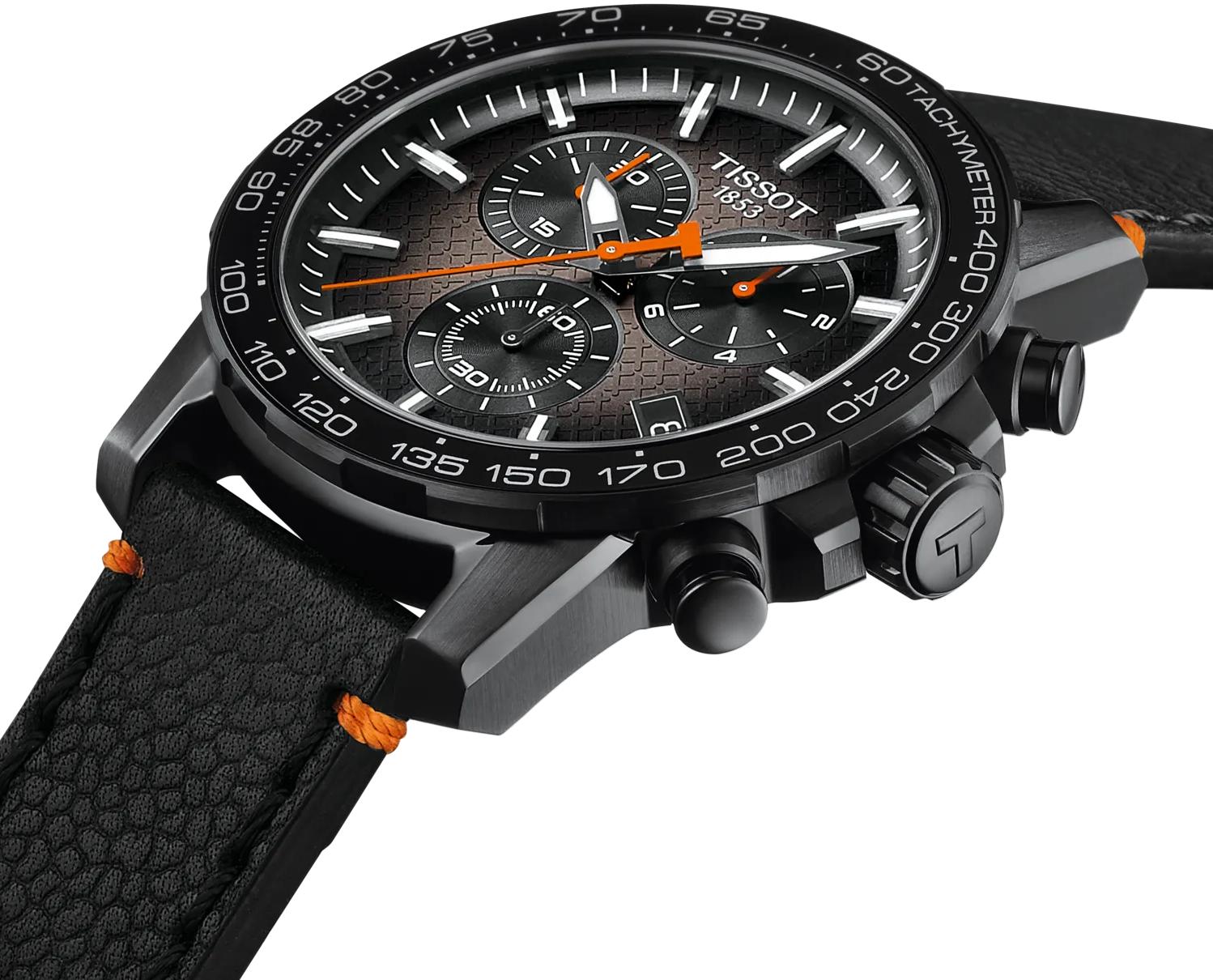 Мужские оригинальные часы Tissot Supersport Chrono Basketball Edition — это современный и брутальный спортивный хронограф, который сочетает в себе высокое качество швейцарских часов и дизайн, вдохновленный баскетбольной динамикой, что подчеркивает давнюю связь бренда Tissot с этим видом спорта. Градиентный серо-черный циферблат с оригинальным узором в виде баскетбольной сетки и оранжевая прострочка по углам ремешка — это дань уважения данной дисциплине и ее культуре. Модель заключена в корпус круглой формы диаметром 45,5 мм из нержавеющей стали 316L с черным PVD-покрытием и имеет фиксированный безель с тахиметрической шкалой, благодаря чему Supersport обладает ярким характером. Циферблат диаметром 29,8 мм защищает устойчивое к появлению царапин сапфировое стекло. Часы оснащены кварцевым механизмом швейцарского производства (калибр 13 1/4'') с функцией EOL (индикатор заряда батареи), который сообщит о необходимости замены элемента питания типа Renata 394, что очень важно для покупателя. Функционал включает в себя 30-минутный и 1/10-секундный счетчики, центральную 60-секундную стрелку хронографа, а также функции ADD и SPLIT. Вес этих оригинальных часов составляет 104 г, толщина корпуса — 11,92 мм, а ширина ушка — 22 мм. Индексы и стрелки имеют покрытие Super-LumiNova для легкой видимости времени, что делает модель идеальным аксессуаром для мужчин с уверенным стилем. Водонепроницаемость швейцарских часов составляет 100 метров (10 АТМ/bar): подходят для плавания и погружения на глубину 5-7 м (выдвигать заводную головку и нажимать кнопки, находясь в воде, нельзя). Ремешок выполнен из кожи черного цвета и имеет стандартную застежку с системой быстрой замены. Вы можете персонализировать аксессуар, комбинируя его с другим ремешком благодаря простой системе взаимозаменяемости.