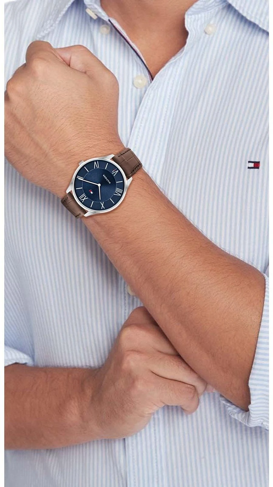 Эти изысканные часы оснащены кварцевым механизмом Basic Slim. Корпус диаметром 43 мм и толщиной 6,1 мм придают им элегантный вид. Темно-синий циферблат защищен минеральным стеклом, а коричневый кожаный ремешок легко фиксируется на запястье благодаря застежке-язычку. Водонепроницаемость до 3 атм обеспечивает оптимальную работу часов в любых условиях.