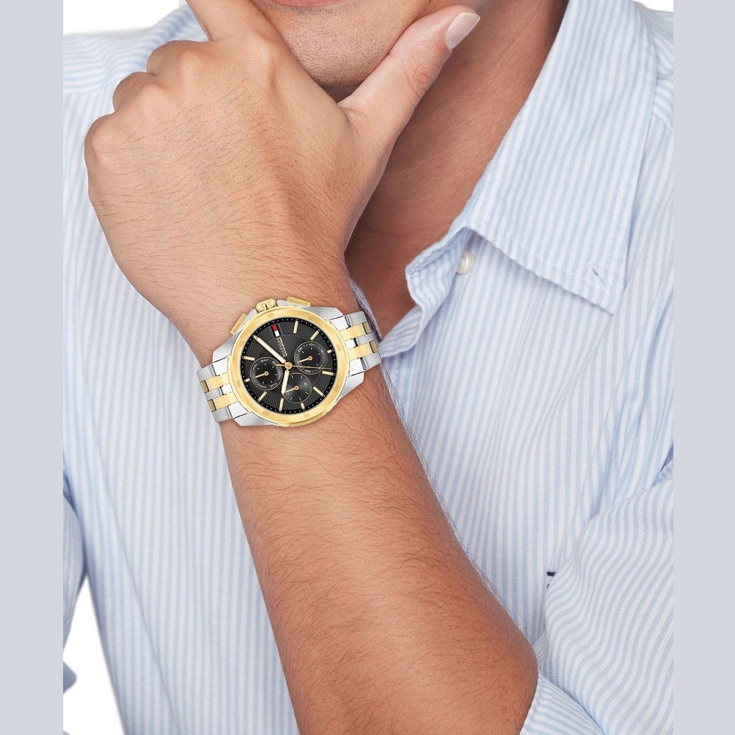 Представляем многофункциональные мужские часы Tommy Hilfiger - 1710621. Они отличаются элегантным и стильным дизайном, идеально подходящим для запястья любого современного мужчины. Благодаря кварцевому многофункциональному механизму, диаметру корпуса 44 мм и толщине 11,7 мм эти часы сочетают в себе функциональность и стиль. Ремешок шириной 22 мм покрыт тонким ионным золотом 2, что придает им нотку роскоши, а циферблат из минерального стекла серого цвета добавляет изысканности. Часы с двухцветным ремешком из нержавеющей стали отличаются прочностью и стильным дизайном. Водонепроницаемость 5 АТМ и кнопочная застежка делают эти часы идеальными для любого случая. Подчеркните свой стиль с этими незаменимыми часами.
