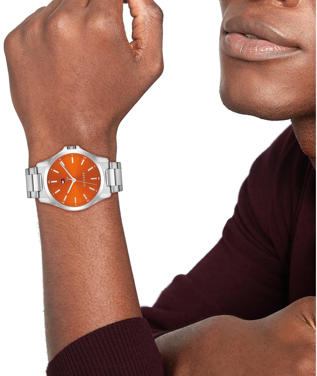 Мужские часы Tommy Hilfiger 1710678 — это гармоничное сочетание точности кварцевого механизма и яркого стиля. Модель с элегантным 42-миллиметровым корпусом из нержавеющей стали привлекает внимание насыщенным оранжевым циферблатом, который эффектно контрастирует с серебристым стальным браслетом. Практичная водонепроницаемость 3 АТМ обеспечивает защиту от брызг и дождя, а удобная застежка-кнопка гарантирует надежную фиксацию на запястье. Эти часы станут выразительным акцентом вашего повседневного образа, подчеркивая индивидуальность и динамичный характер своего владельца.