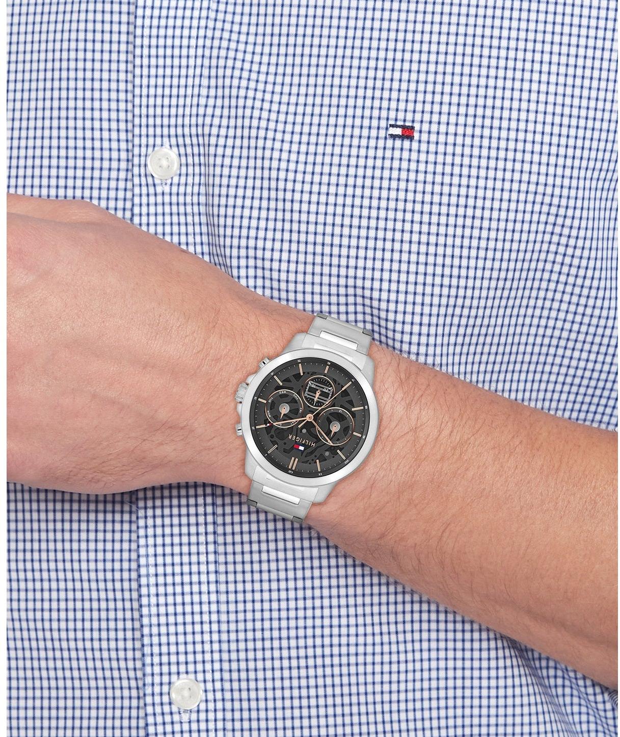 Мужские часы Tommy Hilfiger из коллекции Henry сочетают в себе элегантность и спортивный дух. Модель с 43-миллиметровым корпусом из нержавеющей стали и металлическим браслетом отличается универсальным дизайном. Черный сетчатый циферблат с хронографом и акцентами из розового золота создает эффектный контраст. Часы обладают водонепроницаемостью 50 метров, что позволяет использовать их в душе или во время плавания.