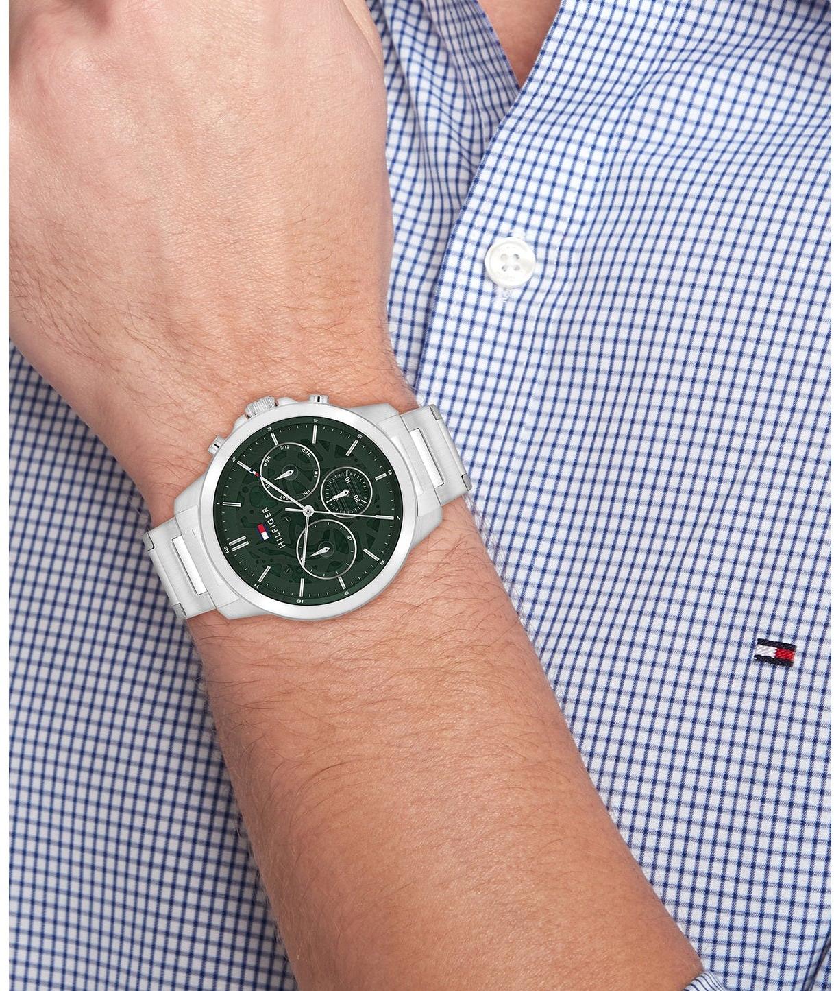 Мужские многофункциональные часы Tommy Hilfiger 1710686 сочетают в себе точность кварцевого механизма и выразительный дизайн. Модель с корпусом диаметром 44 мм из нержавеющей стали привлекает внимание глубоким зеленым циферблатом, дополненным многофункциональными осложнениями. Стальной браслет шириной 21 мм с кнопочной застежкой обеспечивает удобную и надежную посадку на запястье. Благодаря водонепроницаемости 5 АТМ часы устойчивы к брызгам, дождю и кратковременному погружению в воду, что делает их идеальным спутником для активного образа жизни. Эта модель подчеркнет ваш индивидуальный стиль, объединяя в себе надежность, функциональность и современную эстетику.