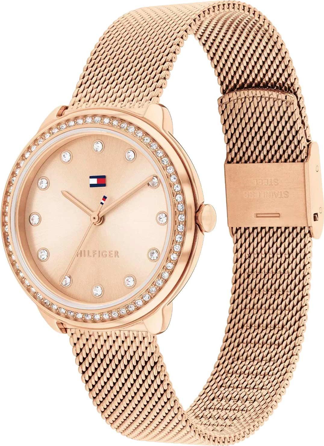 Элегантные женские часы Tommy Hilfiger 1782700 представляют собой гармоничное сочетание утонченного дизайна и часового искусства. Модель с круглым корпусом из нержавеющей стали с IP-покрытием розового золота украшена безелем с россыпью кристаллов и циферблатом с эффектом солнечных лучей, защищенным минеральным стеклом. Инкрустированные кристаллами метки-точки и стальной браслет миланского плетения в тон корпусу подчеркивают изящество и безупречный вкус обладательницы. Эти часы станут не просто аксессуаром, а выразительной деталью образа.
