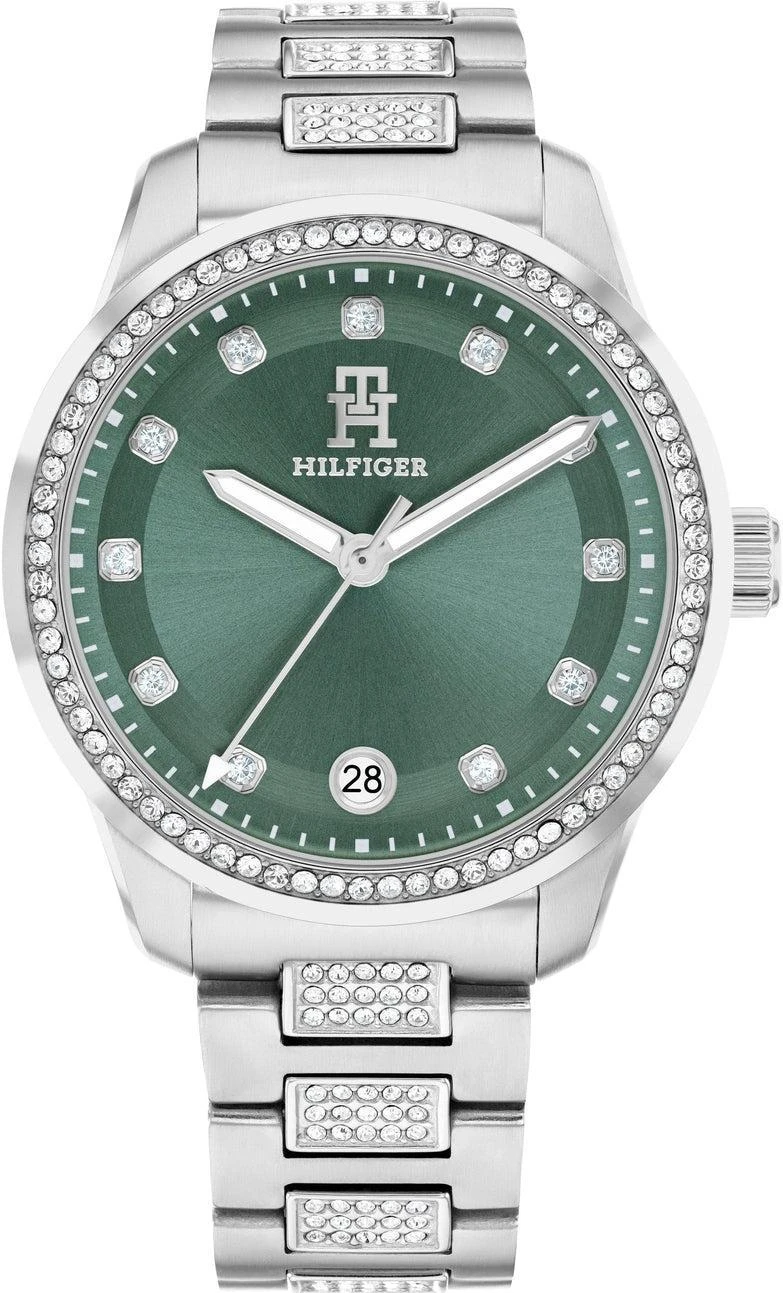 Женские часы Tommy Hilfiger 1782759 из коллекции TH85 — это изысканное сочетание элегантности и функциональности. Модель с зеленым циферблатом украшена индексами из кристаллов и окошком даты в положении «6 часов». Светящиеся стрелки и серебристая секундная стрелка с белым наконечником обеспечивают удобство считывания времени в любое время суток. Корпус диаметром 36 мм из нержавеющей стали обрамлен безелем с россыпью кристаллов, а стальной браслет с инкрустированными средними звеньями и раскладывающейся застежкой с логотипом TH подчеркивает утонченный дизайн. Благодаря кварцевому механизму и водонепроницаемости до 50 метров (5 бар) часы станут надежным и стильным аксессуаром для современной женщины.