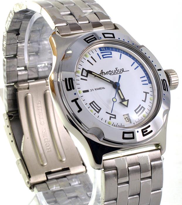 Мужские наручные часы Восток Амфибия 100473. Автоматические с ручным подзаводом. Пружина механизма заводится автоматически благодаря естественным движениям владельца в процессе ежедневной носки часов. Также есть возможность ручного завода. Корпус изготовлен из высококачественной нержавеющей стали 316L с высокими антикоррозийными свойствами. На стрелки и отметки нанесен светонакопительный состав, благодаря этому считывать информацию с циферблата возможно и в темноте. На циферблате отображается текущее число месяца. Браслет из нержавеющей стали. Органическое стекло. Часы являются водонепроницаемыми до 20 Бар. Цвет корпуса: Белый. Цвет циферблата: Белый. Ширина (с заводной головкой): 42мм. Толщина: 15мм. Гарантия: 1 год.