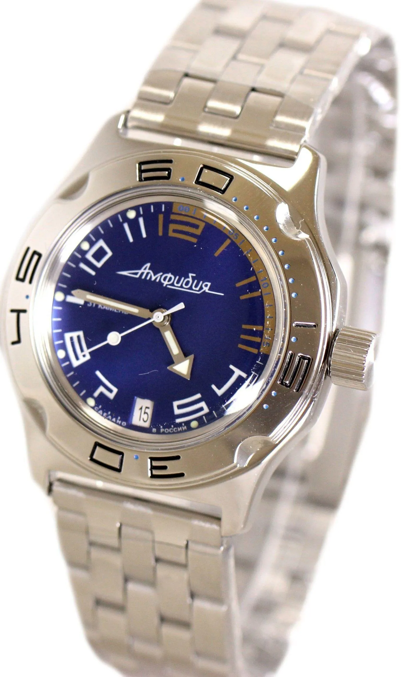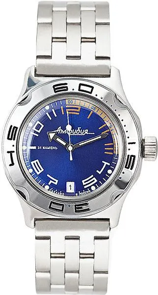 Мужские наручные часы Восток Амфибия 100475. Механические с автоподзаводом. Пружина механизма заводится автоматически благодаря естественным движениям владельца в процессе ежедневной носки часов. Корпус изготовлен из высококачественной нержавеющей стали 316L с высокими антикоррозийными свойствами. На стрелки и отметки нанесен светонакопительный состав, благодаря этому считывать информацию с циферблата возможно и в темноте. На циферблате отображается текущее число месяца. Браслет из нержавеющей стали. Прочное, устойчивое к царапинам минеральное стекло защищает часы от повреждений. Часы являются водонепроницаемыми до 20 Бар. Цвет корпуса: Синий. Цвет циферблата: Синий. Ширина (с заводной головкой): 42мм. Толщина: 15мм. Гарантия: 1 год.