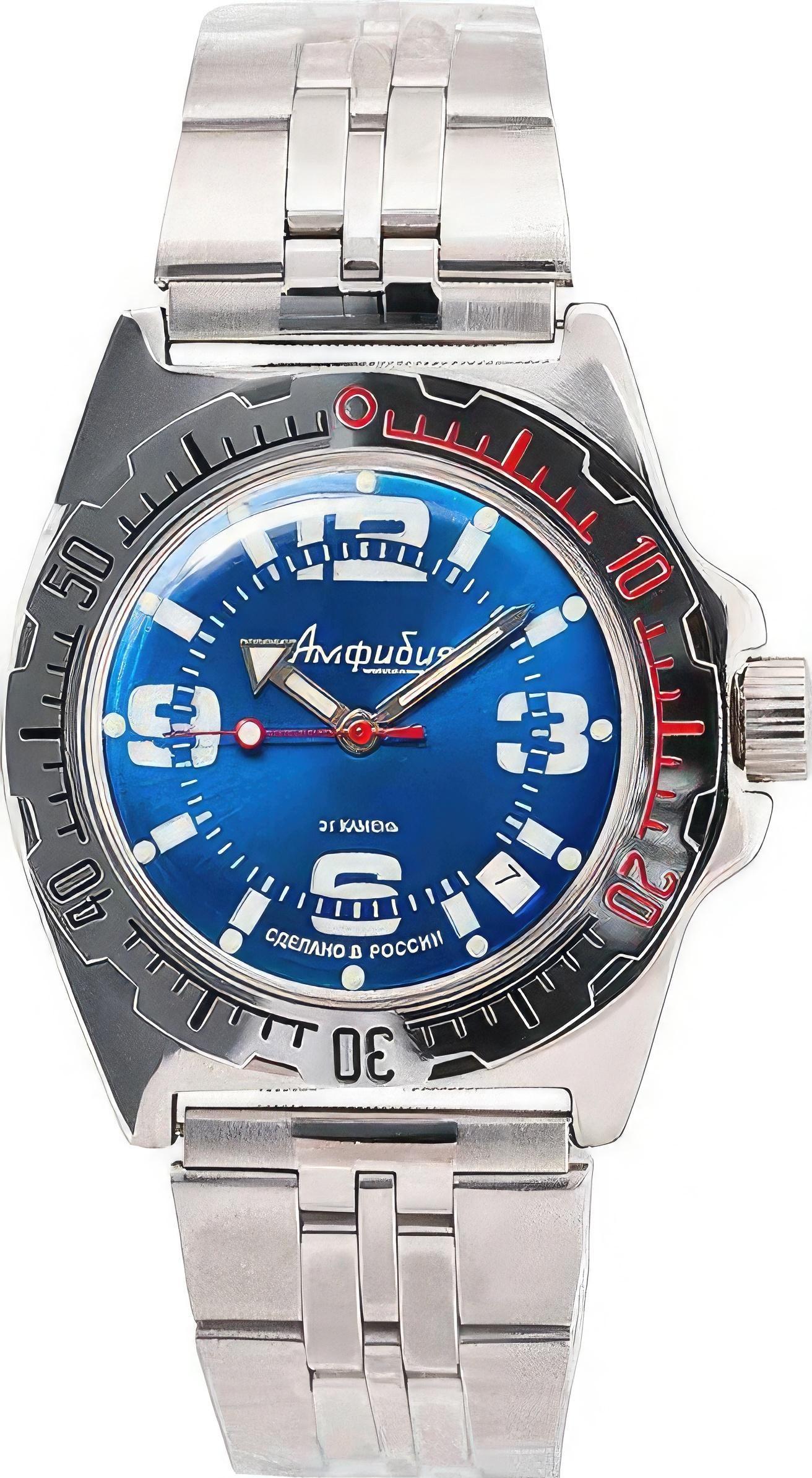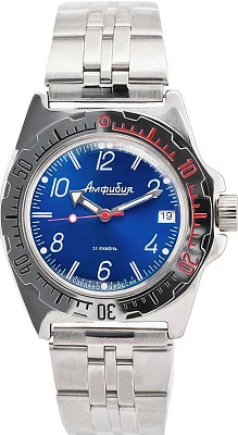 Мужские наручные часы Восток Амфибия 110902. Автоматические с ручным подзаводом. Пружина механизма заводится автоматически благодаря естественным движениям владельца в процессе ежедневной носки часов. Также есть возможность ручного завода. Корпус изготовлен из высококачественной нержавеющей стали 316L с высокими антикоррозийными свойствами. На стрелки и отметки нанесен светонакопительный состав, благодаря этому считывать информацию с циферблата возможно и в темноте. На циферблате отображается текущее число месяца. Браслет из нержавеющей стали. Органическое стекло. Часы являются водонепроницаемыми до 20 Бар. Цвет корпуса: Синий. Цвет циферблата: Синий. Ширина (с заводной головкой): 42мм. Толщина: 15мм. Гарантия: 1 год.